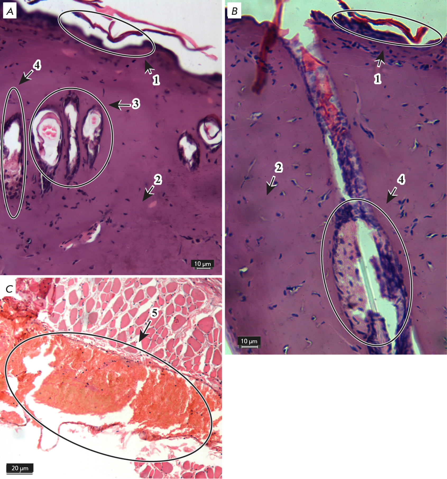 Fig. 3. Morphological changes in the skin 24 h after thermal burn. Hematoxylin and eosin stain.×20 (A, B) and×40 (C) objectives.1 – epidermis,2 – dermis,3 – hair follicles,4 – sebaceous glands,5 – blood vessels