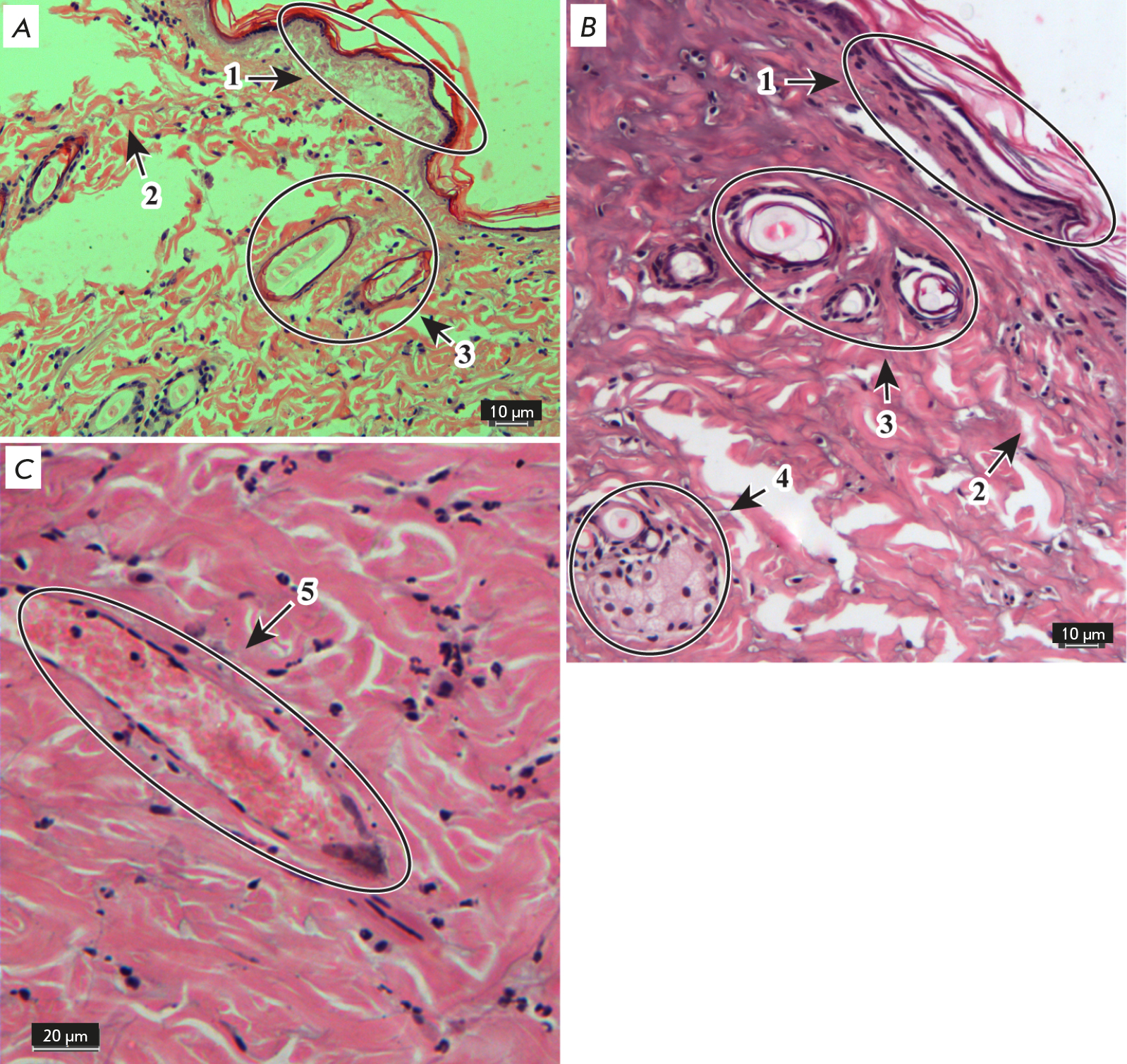 Fig. 4. Morphological changes in the skin with burn injury 24 h after application of liposomes with 26% of phosphatidylcholine. Hematoxylin and eosin stain.×20 (A, B) and×40 (C) objectives.1 – epidermis,2 – dermis,3 – hair follicles,4 – sebaceous glands,5 – blood vessels