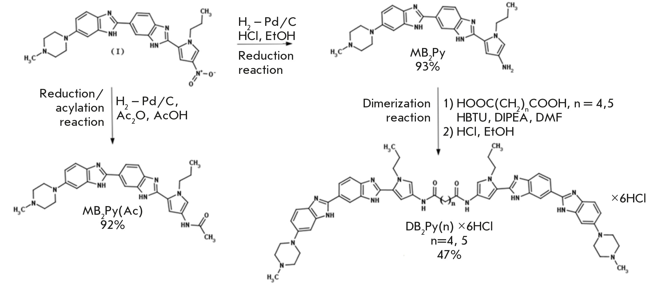 The dimeric bis-benzimidazole-pyrroles, DB2Py(4, 5), were synthesized from 6-[6-(4-methylpiperazin-1-yl)-1H-1,3-benzodiazol-2-yl]-2-(4-nitro-1-propyl-1H-pyrrol-2-yl)-1H-1,3-benzodiazole (I) (Fig. 2) obtained in the Laboratory of DNA-Protein Interactions at the Institute of Molecular Biology of the Russian Academy of Sciences. Compound (I) was used to obtain the monomeric ligand MB2Py(Ac) by reducing the parent compound in a hydrogen current in glacial acetic acid in the presence of acetic anhydride on 10% palladium with carbon as a catalyst. A monomeric unit of MB2Py was dimerized into two dimeric compounds DB2Py(n) with a series of aliphatic normal α,ω-dicarboxylic acids in the presence of HBTU as a condensing agent and DIPEA as a DMF base, differing in the number of methylene links in the linker: n = 4, 5 (Fig. 2).