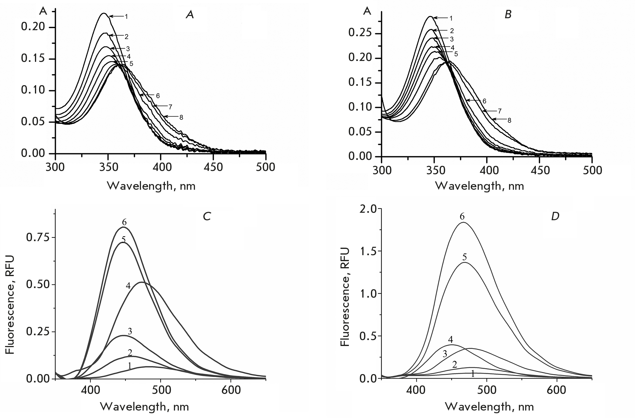 Fig. 3. Absorption and fluorescence spectra of free DB2Py(n) and its complex with DNA. (A) – absorption spectra of DB2Py(4) in absence (1) and presence of DNA (2–8); [DB2Py(4)] 4.06 × 10-6 М; 0.001 М sodium cacodylate. [DNA] 1 – 0; 2 – 0.25; 3 – 0.49; 4 – 0.98; 5 – 1.48; 6 – 2.45; 7 – 14.67; 8 – 121.9 × 10-6 М b.p. respectively; optical path length, 10 mm. (B) – absorption spectra of DB2Py(5) in absence (1) and presence of DNA (2–8); [DB2Py(5)] 4.29 × 10-6 М; 0.001 М sodium cacodylate. [DNA] 1 – 0; 2 – 0.25; 3 – 0.49; 4 – 0.98; 5 – 1.48; 6 – 2.45; 7 – 14.67; 8 – 121.9 × 10-6 М b.p. respectively; optical path length, 10 mm. (C) – fluorescence spectra of DB2Py(4) in absence (1) and presence of DNA (2–6). [DB2Py(4)] 4.6 × 10-6 M; [DNA]1 – 0; 2 – 3; 3 – 6; 4 – 18; 5 – 30; 6 – 54 × 10-6 M b.p. respectively. Buffer: 10 mМ PBS (рН 7.4). Excitation wavelength, 320 nm; slot width, 5 nm; cell size 10 × 10 mm; 22°C. (D) – fluorescence spectra of DB2Py(5) in absence (1) and presence of DNA (2–6). [DB2Py(5)] 2.3 × 10-6 M; [DNA]1 – 0; 2 – 3; 3 – 6; 4 – 18; 5 – 54; 6 – 78 × 10-6 M b.p. respectively. Buffer: 10 mМ PBS (рН 7.4). Excitation wavelength, 320 nm; slot width, 5 nm; cell size 10 × 10 mm; 22°C