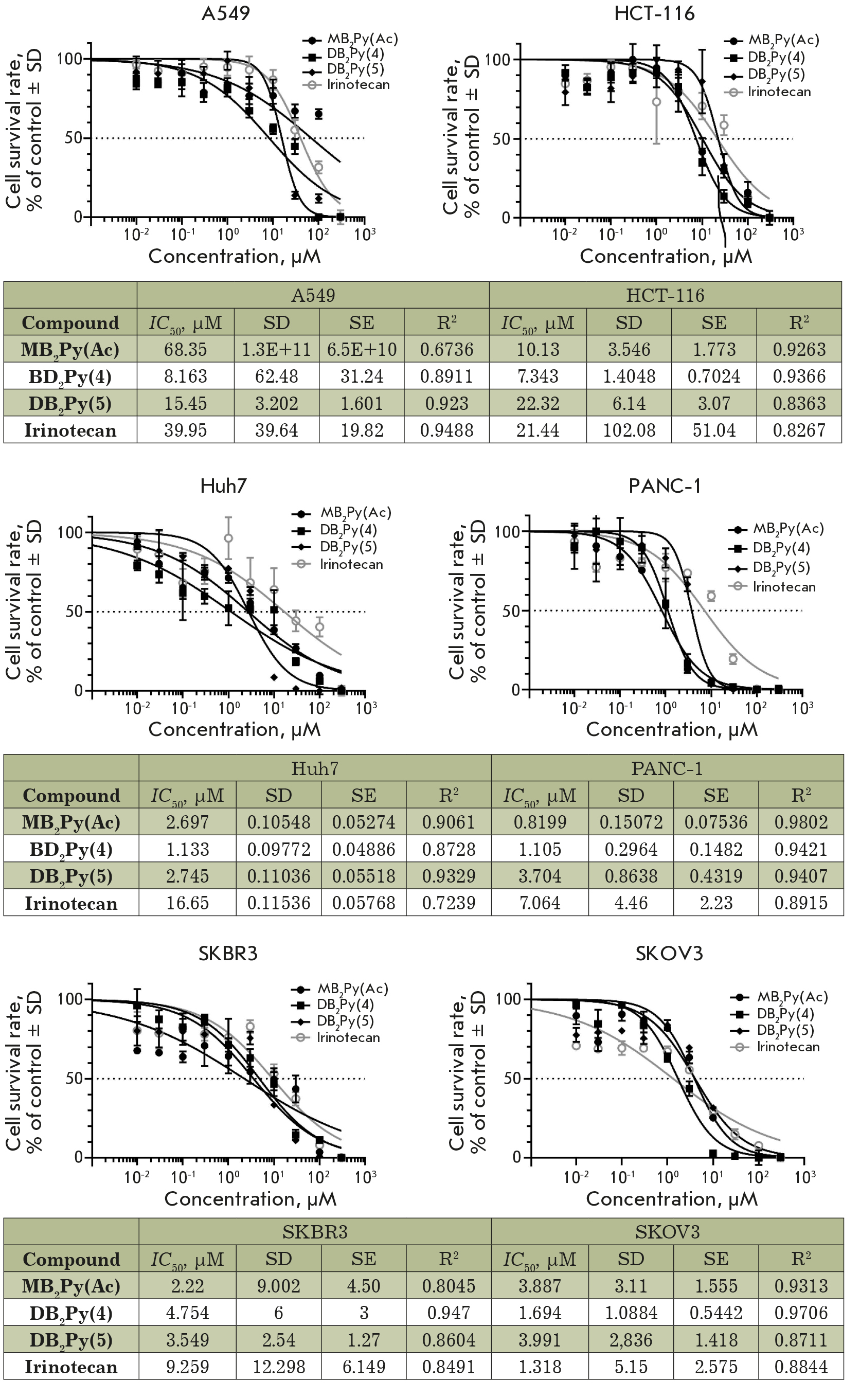 Fig. 5. Cytotoxicity values (IC50) in micromoles (µM) of the monomeric and dimeric bis-benzimidazole-pyrroles compared to irinotecan in various human tumor cell lines. SD – standard deviation, SE – standard error, R2 – determination coefficient