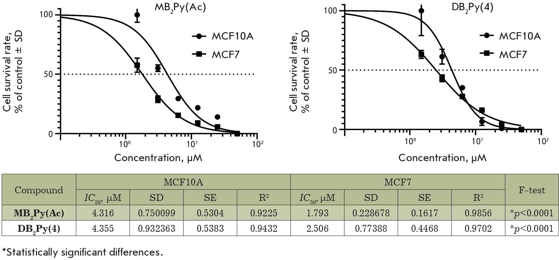 Fig. 6. Cytotoxicity of the new bis-benzimidazole-pyrroles in MCF10A (human breast epithelial cells, normal cell line) and on MCF-7 (breast cancer). SD – standard deviation, SE – standard error, R2 – coefficient of determination, F-test – statistical criterion