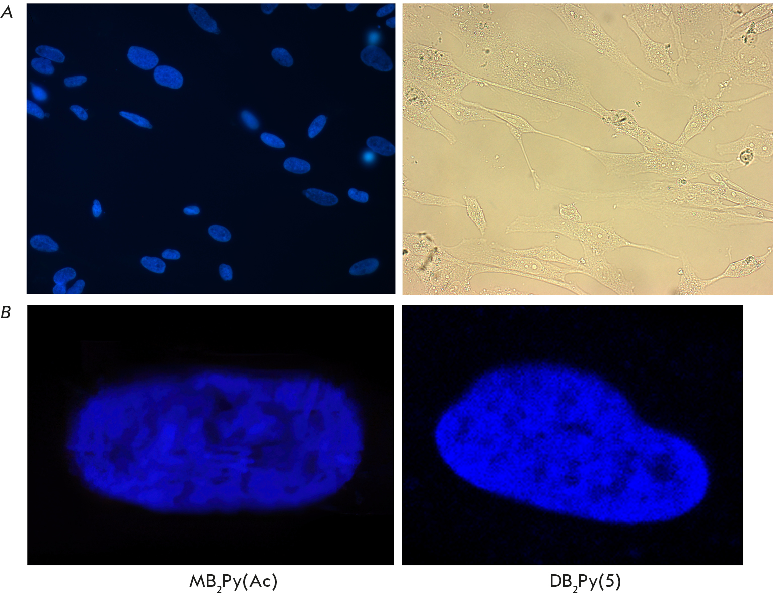 Fig. 8. Fluorescent staining of Gbl13n glioblastoma cells incubated with monomeric and dimeric bis-benzimidazole-pyrroles at a concentration of 2 μM for 48 h.(A) – population of cells stained with the bis-benzimidazole-pyrrole DB2Py(5). On the left is a DAPI filter, on the right is a phase-contrast image. MB2Py(Ac) staining looks similar after 2 days; (B) – a picture of stained nuclei obtained using a confocal microscope