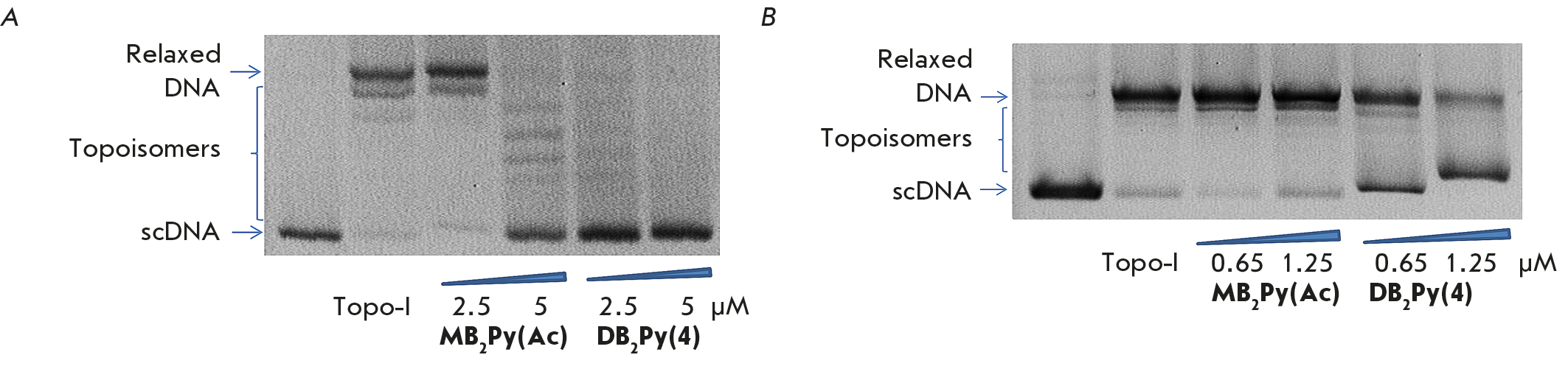 Fig. 10. Calf-thymus Topo-I inhibition by MB2Py(Ac) and DB2Py(4). (A) – effect of the compounds on Topo-I activity at concentrations of 2.5 and 5 µM. (B) – at concentrations of 0.65 and 1.25 µM