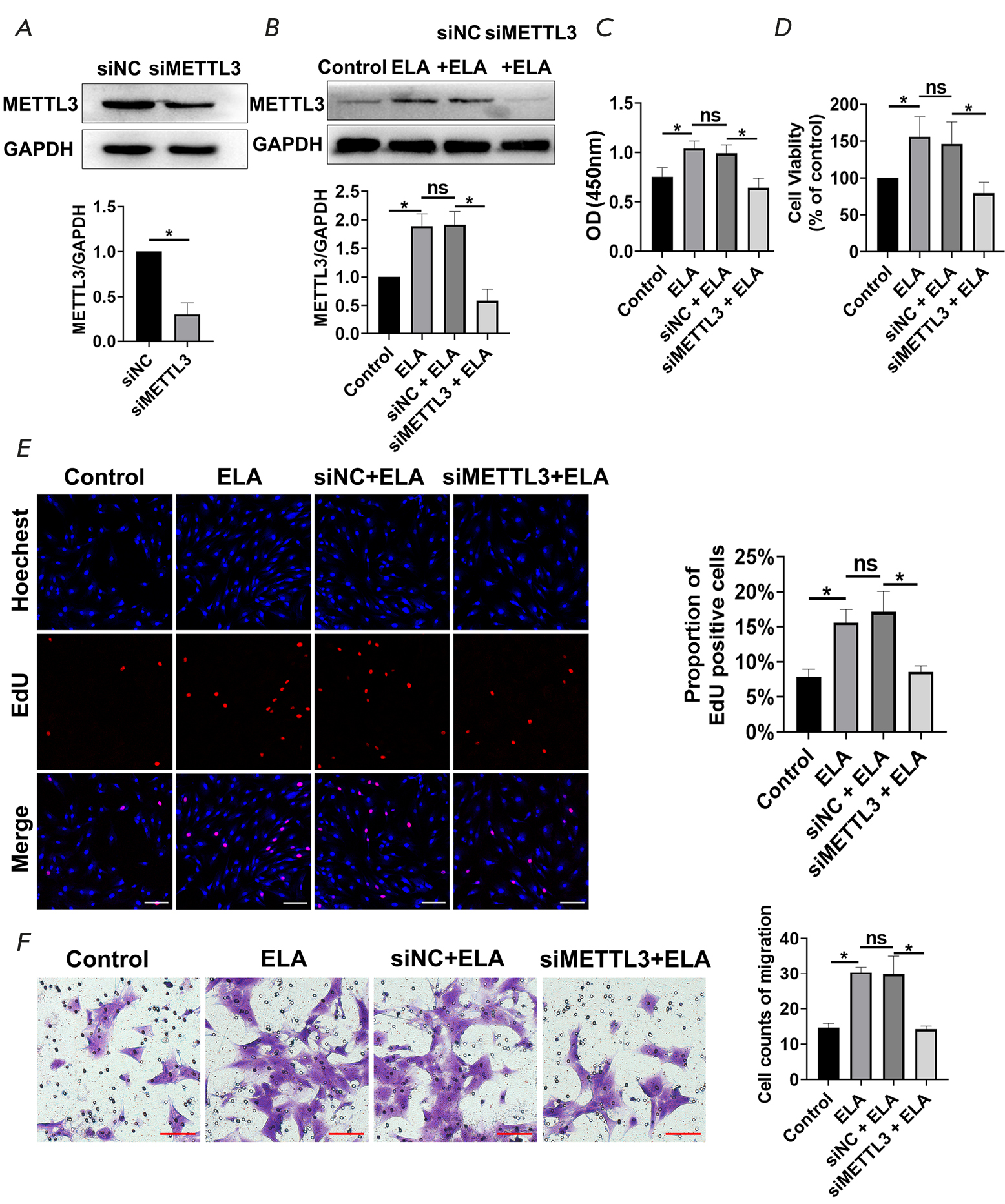 Fig. 3. ELA promotes MSC proliferation and migration by upregulating METTL3.(A) – METTL3 knockdown was successfully performed using small interfering RNA.(B) – METTL3 knockdown attenuated the upregulation of METTL3 caused by ELA at the protein level.(C, D) – CCK-8 assay results demonstrate that METTL3 knockdown reversed the synergistic effects of ELA-enhanced MSC proliferation and viability.(E) – EdU assay shows that METTL3 knockdown decreases the percentage of EdU-positive MSCs that was increased by ELA. Scale bar 100 μm.(F) – Transwell assay results show the inhibitory effects of METTL3 knockdown on cell migration was increased by ELA.Scale bar 100 μm. *P < 0.05; ns – no significance; siMETTL3 – METTL3 knockdown;siNC – negative control
