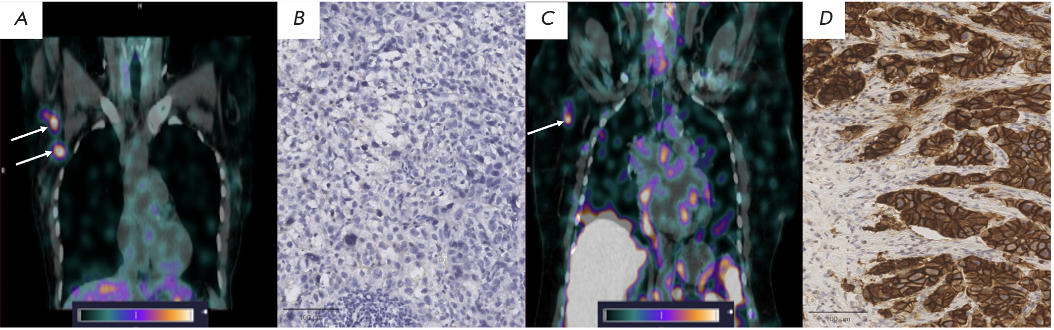 Fig. 2. [99mTc]Tc-(HE)3-G3 uptake in mALNs of BC patients 4 h after administration: (A) – [99mTc]Tc-(HE)3-G3 uptake in HER2-positive mALNs (indicated by white arrows); (B) – IHC imaging of a HER2-positive mALN (×400); (C) – [99mTc]Tc-(HE)3-G3 uptake in a HER2-negative mALN (indicated by the white arrow); (D) – IHC imaging of a HER2-negative mALN (×400)