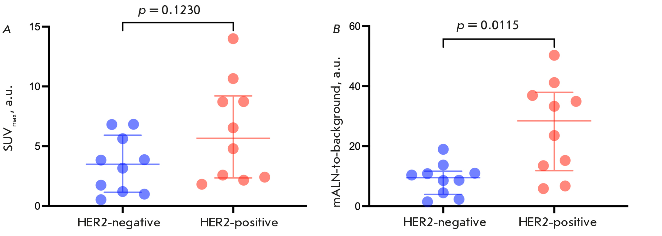 There were no differences in SUVmax among BC patients with different HER2/neu statuses in mALNs (6.2 ± 4.2 for positive expression and 3.4 ± 2.4 for negative expression) (p = 0.1230, Mann–Whitney test). However, there were statistical differences in the mALN-to-background ratios: it was higher in the subgroup of patients with a HER2-positive mALN status (26.1 ± 15.4) than in the subgroup with a HER2-negative mALN status (9.0 ± 5.3) (p = 0.0115, Mann–Whitney test) (Table 1, Fig. 3).
