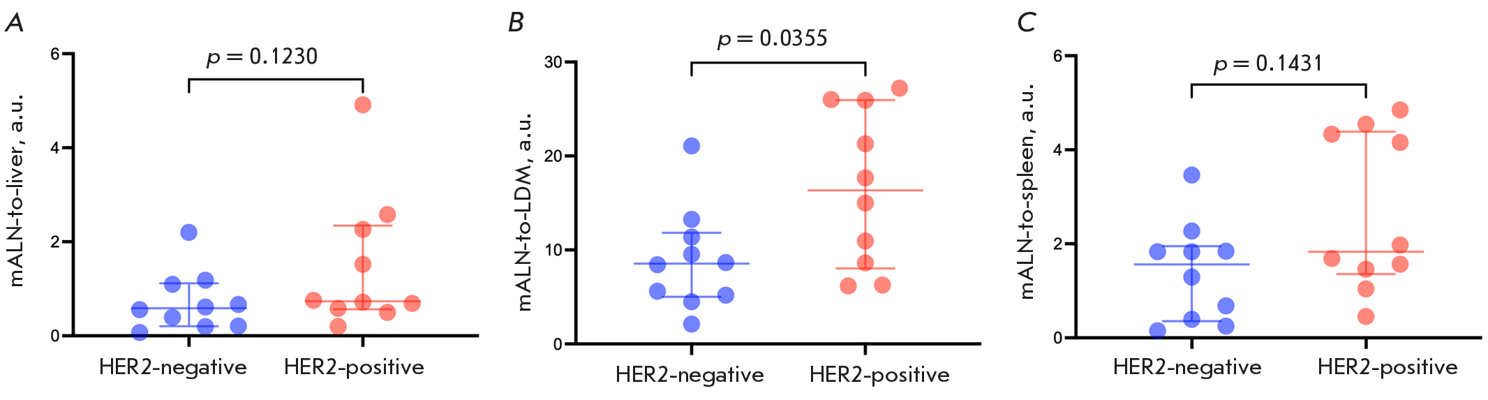Calculations of mALN-to-reference organ ratios revealed that the mALN-to-LDM ratio was higher in HER2-positive mALNs than in HER2-negative mALNs (16.5 ± 8.3 and 8.9 ± 5.4, respectively) (p = 0.035, Mann–Whitney test) (Table 1, Fig. 4).