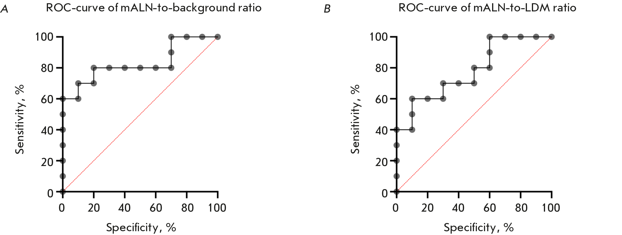 Fig. 5. ROC-curves of mALN-to-background (A) and mALN-to-LDM (B) ratios upon HER2/neu status detection in mALNs of BC patients 4 h after administration of [99mTc]Tc-(HE)3-G3