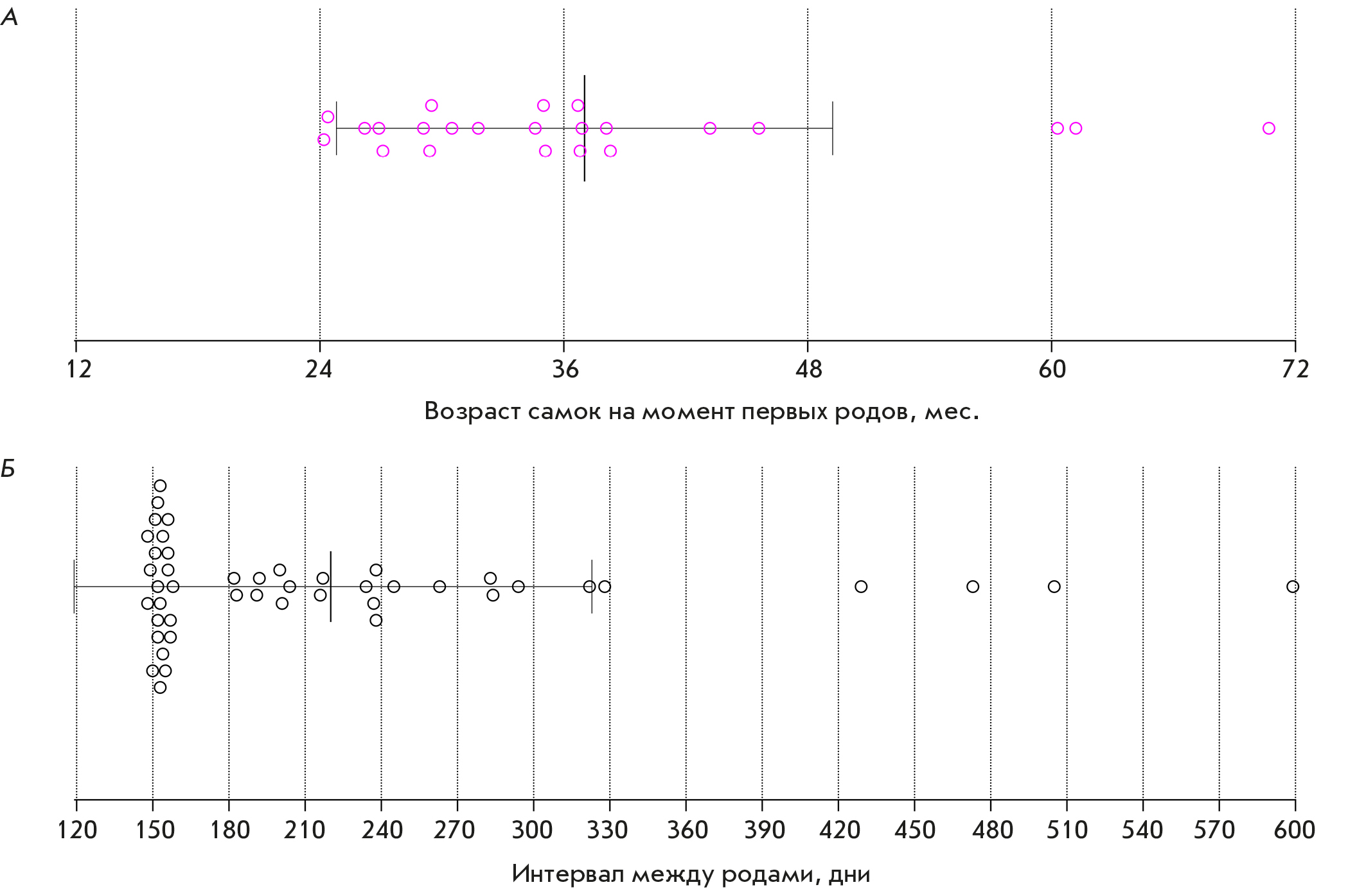Рис. 1. Частота родов у самок C. jacchus в условиях лабораторного содержания. Розовыми окружностями обозначен возраст самок (n = 23) на момент первых родов (А). Черными окружностями обозначены интервалы между родами (n = 46) (Б). Вертикальными сплошными линиями обозначены среднее и стандартное отклонение