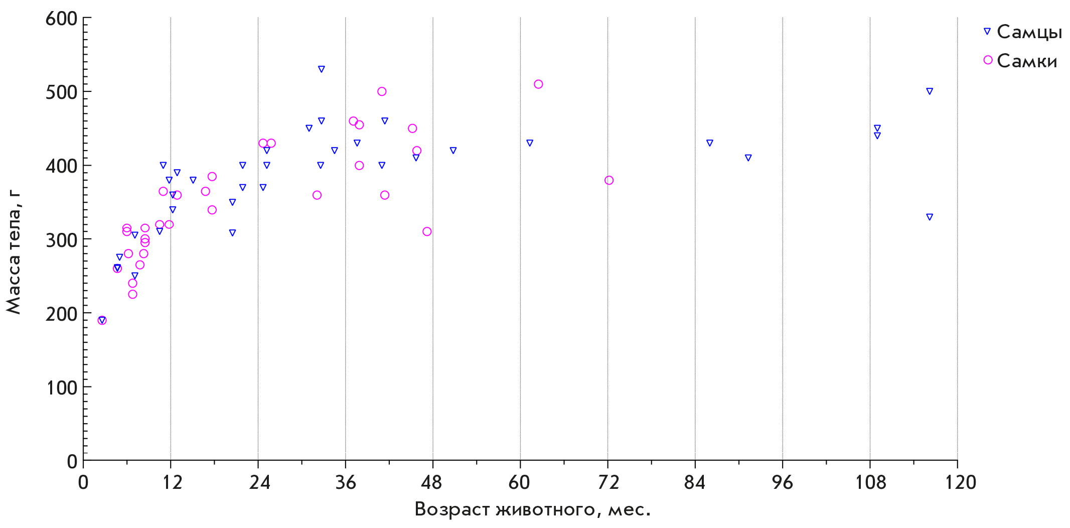 В апреле 2023 года в течение недели было проведено взвешивание 69 содержавшихся в Лаборатории животных (37 самцов и 32 самки в возрасте от 2.6 мес. до 9.6 лет). Результаты приведены на рис. 2.