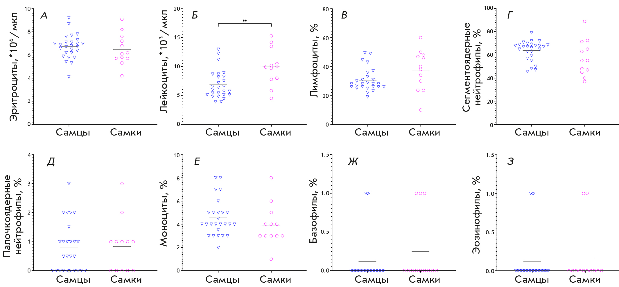 Fig. 3. Counts of (A) erythrocytes, (B) leukocytes, and the percentage of (C) lymphocytes, (D) segmented neutrophils, (E) band neutrophils, (F) monocytes, (G) basophils and (H) eosinophils in the leukocyte differential in the blood of laboratory-bred common marmosets (N = 38). Horizontal lines show the mean value. The statistical significance of the differences in the studied parameters between males and females was assessed using the Mann–Whitney test. **statistically significant differences (p < 0.05)