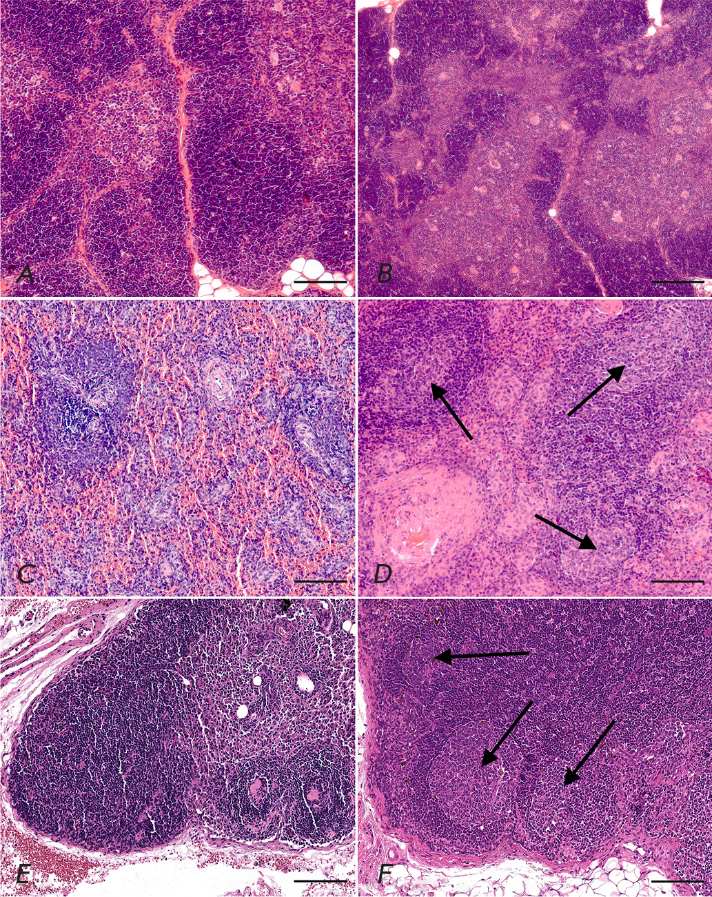 Fig. 5. Lymphoid organs of common marmosets immunized with a whole-virion inactivated vaccine CoviVac (B, D, and E) compared with the animals who received the placebo (A, C, and E). The morphology of the following lymphoid organs is presented: (A, B) – thymus; (C, D) – spleen; (E, F) – the regional (inguinal) lymph node. Arrows show the germinal centers in the cortical plateau of the lymph node and in the mantle zone of the white pulp of the spleen, the region of T-dependent B-immunogenesis. Hematoxylin and eosin, ×100 magnification. Scale bar, 200 µm
