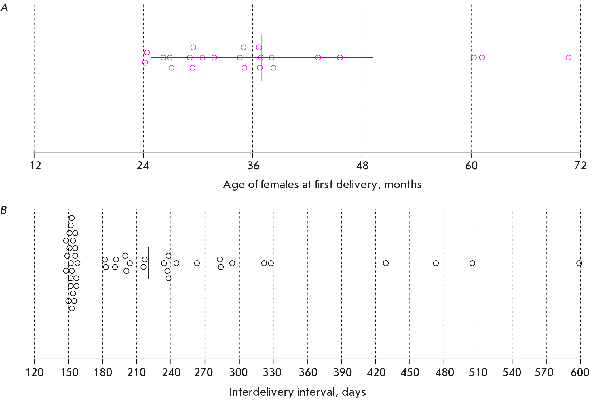 Рис. 1. Частота родов у самок C. jacchus в условиях лабораторного содержания. Розовыми окружностями обозначен возраст самок (n = 23) на момент первых родов (А). Черными окружностями обозначены интервалы между родами (n = 46) (Б). Вертикальными сплошными линиями обозначены среднее и стандартное отклонение