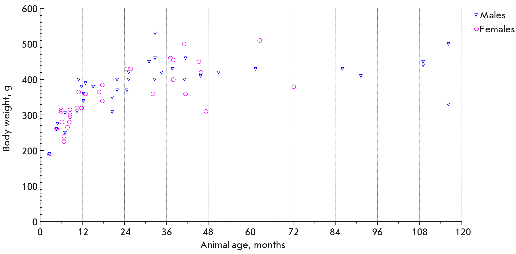 В апреле 2023 года в течение недели было проведено взвешивание 69 содержавшихся в Лаборатории животных (37 самцов и 32 самки в возрасте от 2.6 мес. до 9.6 лет). Результаты приведены на рис. 2.