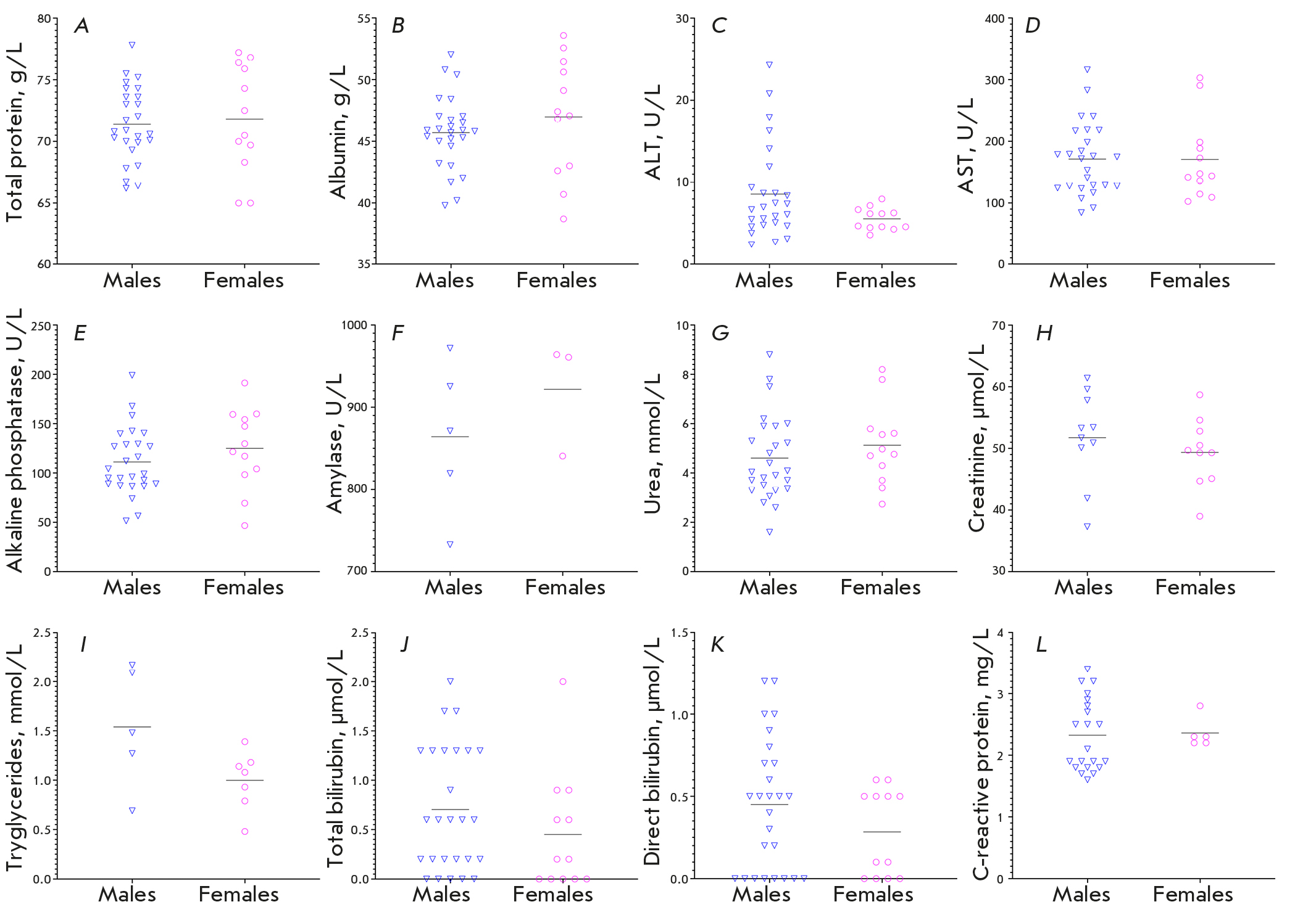 Рис. 4. Результаты биохимического анализа крови приматов C. jacchus, содержащихся в Лаборатории. Представлены уровни общего белка (А), альбумина (Б), аланинаминотрансферазы [АЛТ] (В), аспартатаминотрансферазы [АСТ] (Г), щелочной фосфатазы (Д), амилазы (Е), мочевины (Ж), креатинина (З), триглицеридов (И), общего билирубина (К), прямого билирубина (Л) и С-реактивного белка (М). Уровни креатинина определяли у 20 животных, триглицериды у 12, амилазу у 8, С-реактивный белок – у 26; остальные показатели – у 38. Горизонтальными линиями показано среднее значение. Статистическую значимость различий исследуемых параметров между самцами и самками оценивали с использованием критерия Манна–Уитни