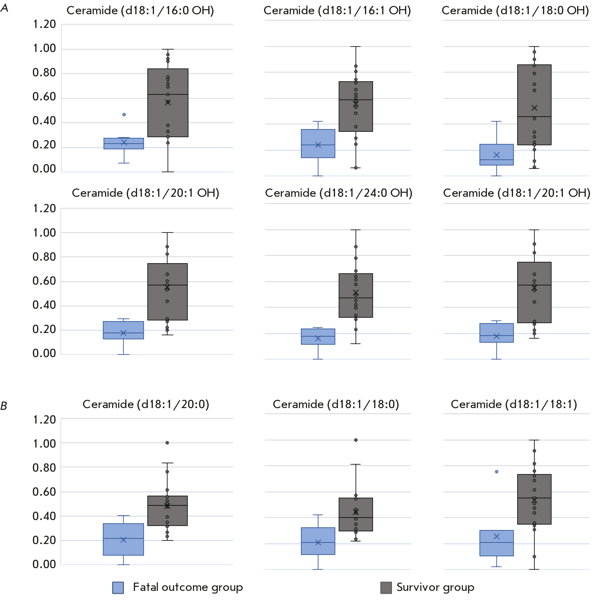 Comparative analysis of the levels of the identified metabolites in the samples showed that the plasma levels of all metabolites in fatal outcome patients were noticeably lower than those in survived patients. The only exception was 5-hydroxyindoleacetic acid, whose level increased more than 1.5-fold. Figure 1 shows the normalized peak areas of several ceramides in the two groups.