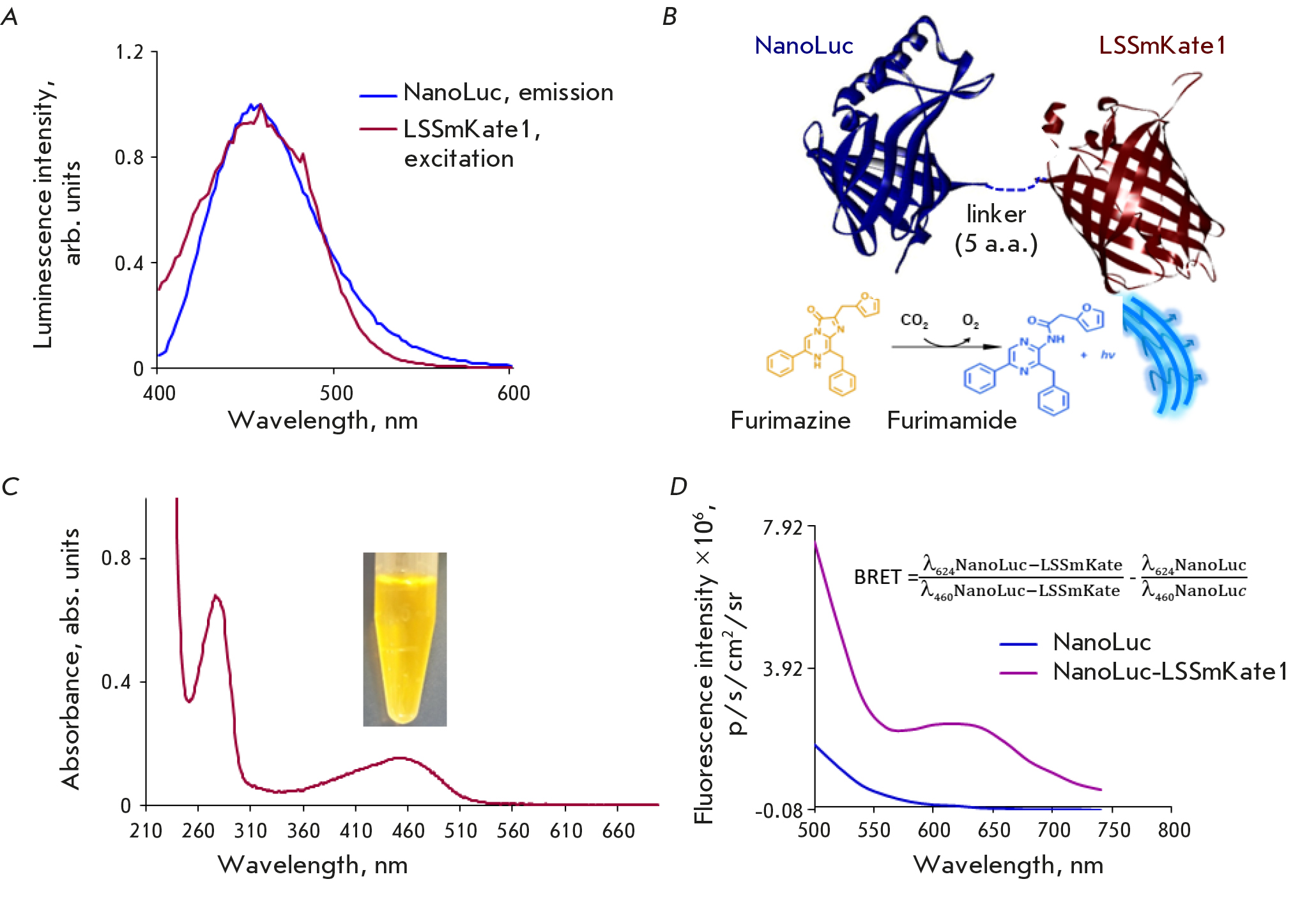 Fig. 2. Characteristics of the NanoLuc-LSSmKate1 BRET sensor. (A) – Normalized luminescence spectra of NanoLuc luciferase in the presence of 30 µM furimazine (blue curve) and LSSmKate1 fluorescence (dark red curve). (B) – Schematic representation of the NanoLuc-LSSmKate1 BRET sensor and the concept at work: NanoLuc luciferase highly specifically oxidizes its substrate furimazine, whose oxidized form, furimamide, emits light in the blue spectral region. Some of this energy is nonradiatively transferred to LSSmKate1 located in the same polypeptide chain as NanoLuc luciferase. LSSmKate1 begins to fluoresce. (C) – Absorption spectrum of the purified NanoLuc-LSSmKate1 protein and a protein sample in vitro. (D) – Fluorescence spectra of NanoLuc-LSSmKate1 (lilac curve) and NanoLuc (blue curve) recorded in the presence of a luciferase substrate on an IVIS Spectrum CT system without excitation by external light (the excitation block mode). A formula for calculating the efficiency of the resonance energy transfer in the NanoLuc-LSSmKate1 system is provided