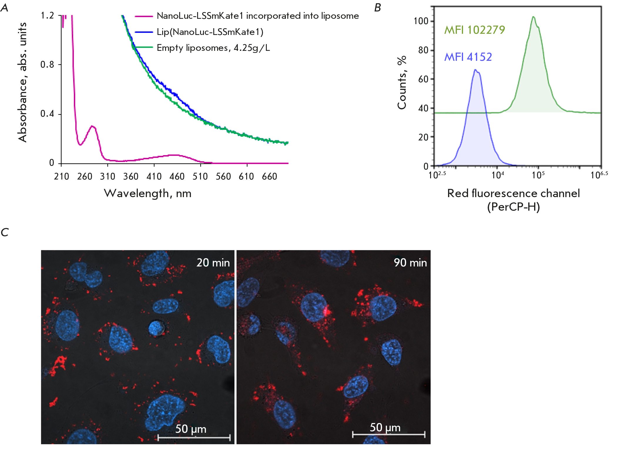 Fig. 3. Characteristics of HER2-specific liposomes loaded with the NanoLuc-LSSmKate1 BRET sensor.(A) – Absorption spectra of empty (green curve) liposomes and those containing NanoLuc-LSSmKate1 (blue curve). The purple curve corresponds to the NanoLuc-LSSmKate1 protein loaded into liposomes. (B) – Flow cytometry data on the receptor-specific interaction of DARP-Lip(NanoLuc-LSSmKate1) with HER2-positive SKOV3ip cells.The blue curve corresponds to the auto-fluorescence of the cells (control), and the green curve corresponds to cells treated with DARP-Lip(NanoLuc-LSSmKate1). Mean fluorescence intensities (MFI) are shown in the pictogram.The signal was detected in the red fluorescence channel (PerCP-H, λem = 615 ± 20 nm) under laser excitation at 488 nm. (C) – Merged confocal images in the blue (λex = 405 nm, detection 410–520 nm) and red (λex = 488 nm, detection 600–755 nm) fluorescence channels of SKOV3ip cells after 20-min (left photo) and 90-min (right image) incubation with DARP-Lip(NanoLuc-LSSmKate1). Nuclei are stained with Hoechst33342