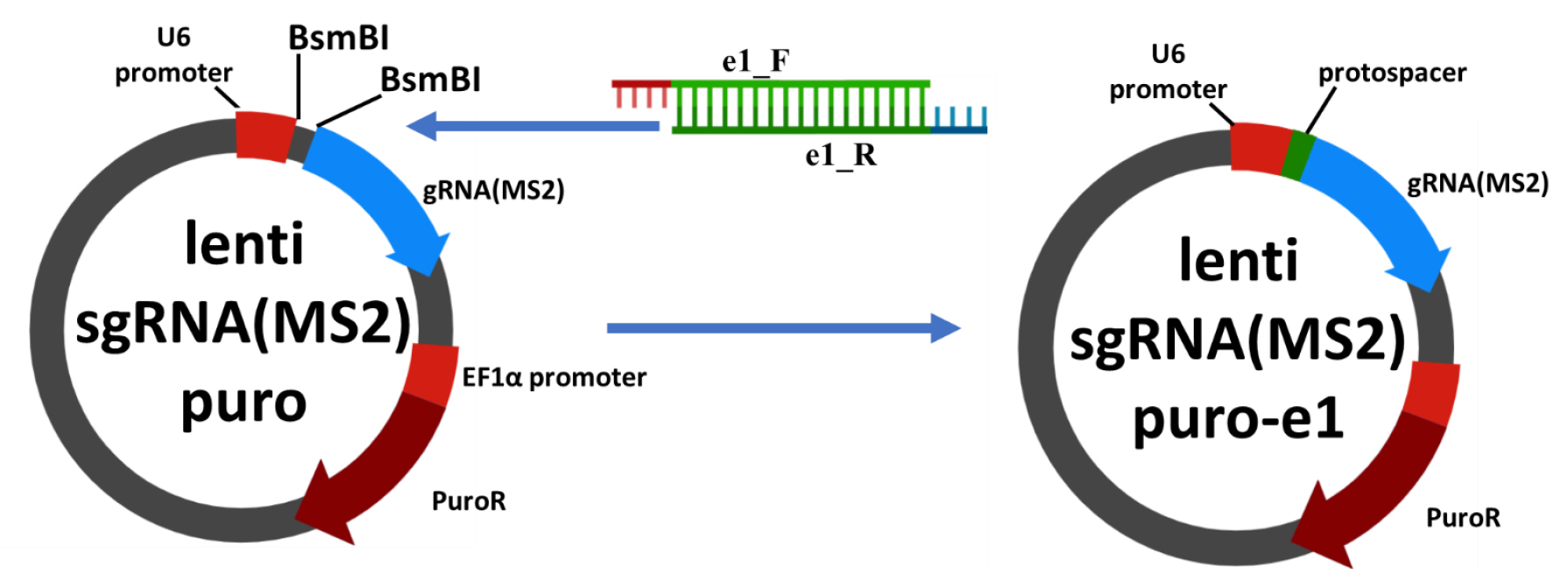 Fig. 1. Schematic cloning of lenti sgRNA(MS2)_puro series plasmids. To obtain a vector encoding chimeric guide RNA, the lenti sgRNA(MS2)_puro vector was treated with the BsmBI restriction endonuclease and ligated with an oligonucleotide duplex corresponding to one of the protospacer sequences (Table 1). Ligation products were cloned using the E. coli Top10 strain. The insertion structure was confirmed by sequencing
