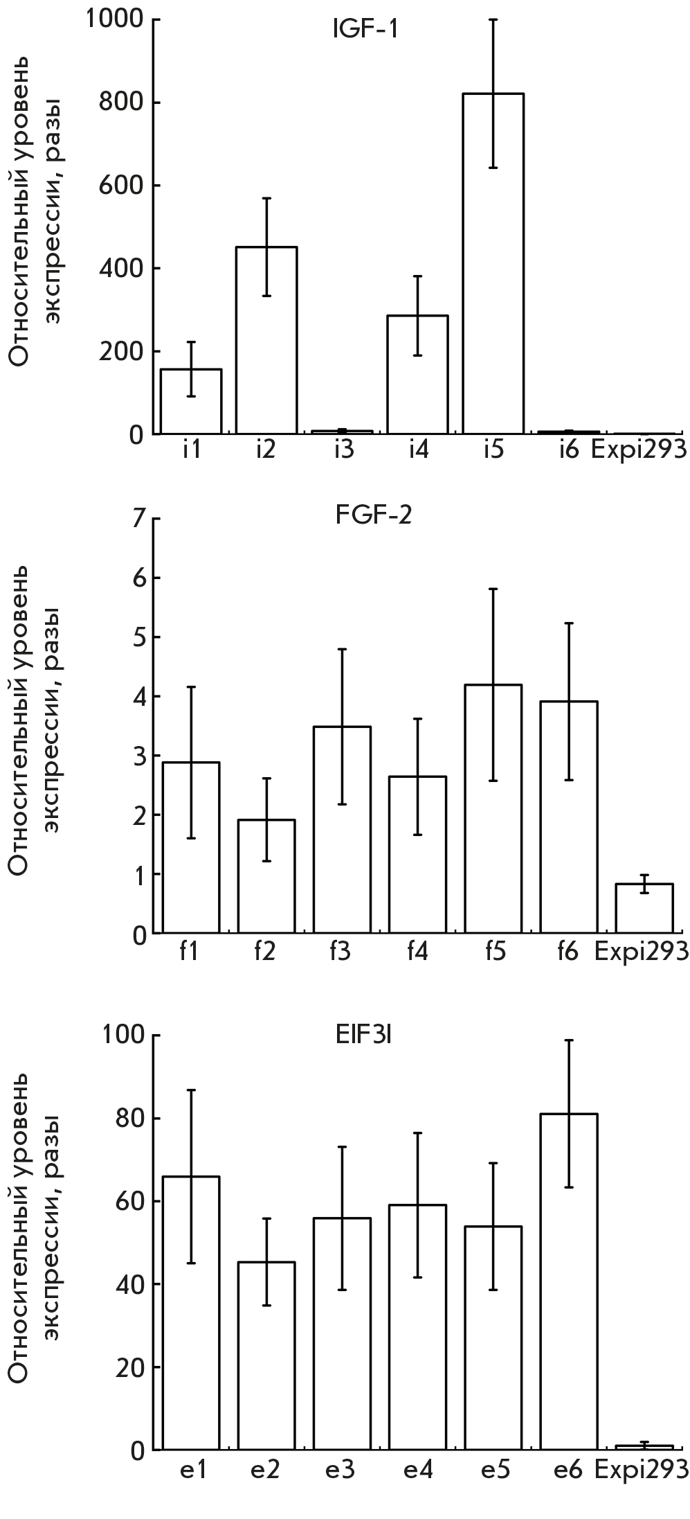 Fig. 1. Fold change of IGF1, FGF2, and EIF3I genes in Expi-dCas9-MS2 cell lines transduced with lentiviral vectors encoding sgRNAs targeting the promoter regions of the respective genes. Lentiviral vectors encoding i1–i6, f1–f6, and e1–e6 sgRNAs (Appendix 2) were used to activate IGF1, FGF2, and EIF3I gene expression. IGF1 expression is not typical of HEK cells; so, fold change was calculated relative to the lowest IGF1 expression in the modified cell line (Expi-dCas9-MS2-i6). FGF2 and EIF3I are expressed in human embryonic kidney cells; so, changes in the expression levels were evaluated relative to the Expi-dCas9-MS2 cell lines. Data are presented as a mean ± SEM