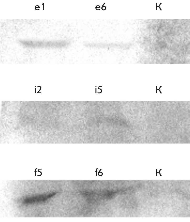 Fig. 2. Western blot analysis of culture medium samples from Expi293F cells with activated expression of growth factor genes. e1 and e6 samples are cells with activated expression of the EIF3I gene; f5 and f6 samples are cells with activated expression of the FGF2 gene; i2 and i5 samples are cells with activated expression of the IGF1 gene. C is Expi293F cells
