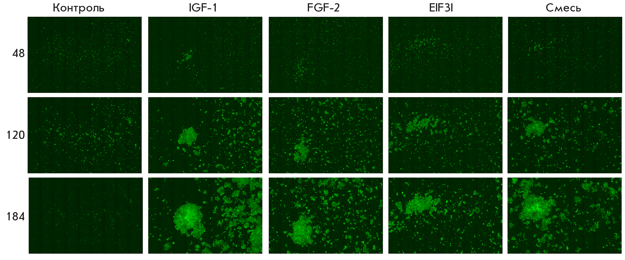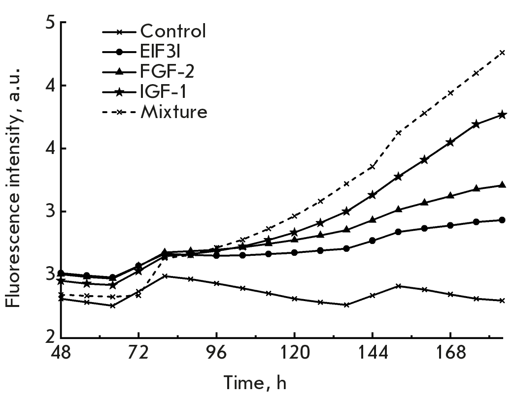 Thus, co-culture of modified cells expressing IGF-1, EIF3I, and FGF-2 in an FBS-free medium increased their proliferative activity compared with that in the control cells.
