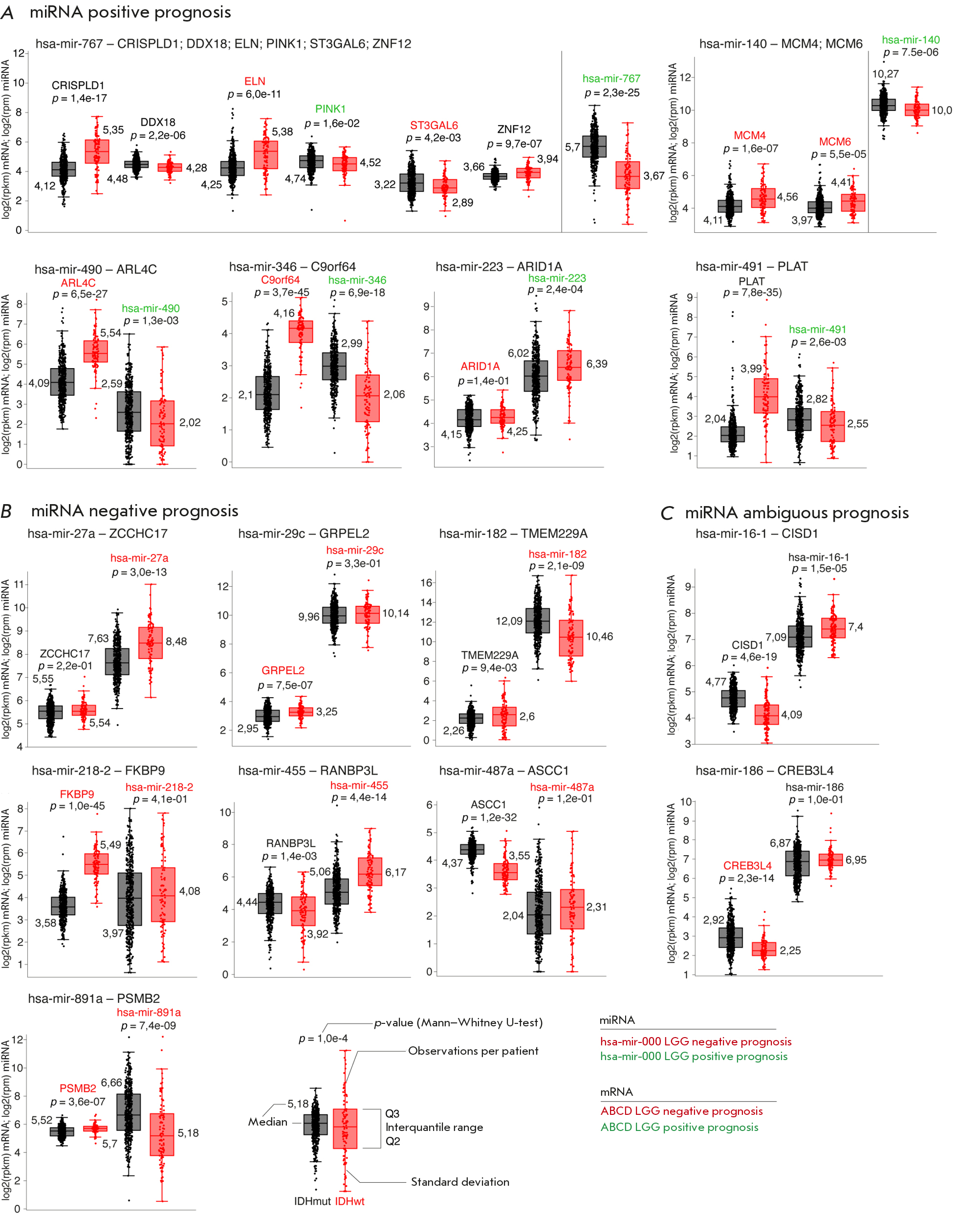 Figure 3 shows the expression levels in these pairs. The microRNA–mRNA pairs are clustered into three groups according to the prognosis of their effects on the disease course (in accordance with the published data); the color designation of names is similar to that used in Fig. 2. The expression levels of each pair in the samples collected from each patient, their median value for a group, and the level of significance of differential expression between the IDHwt and IDHmut groups calculated using the Mann–Whitney test are presented. Detailed analysis of the role of expression levels in the pairs provided in the Discussion section.
