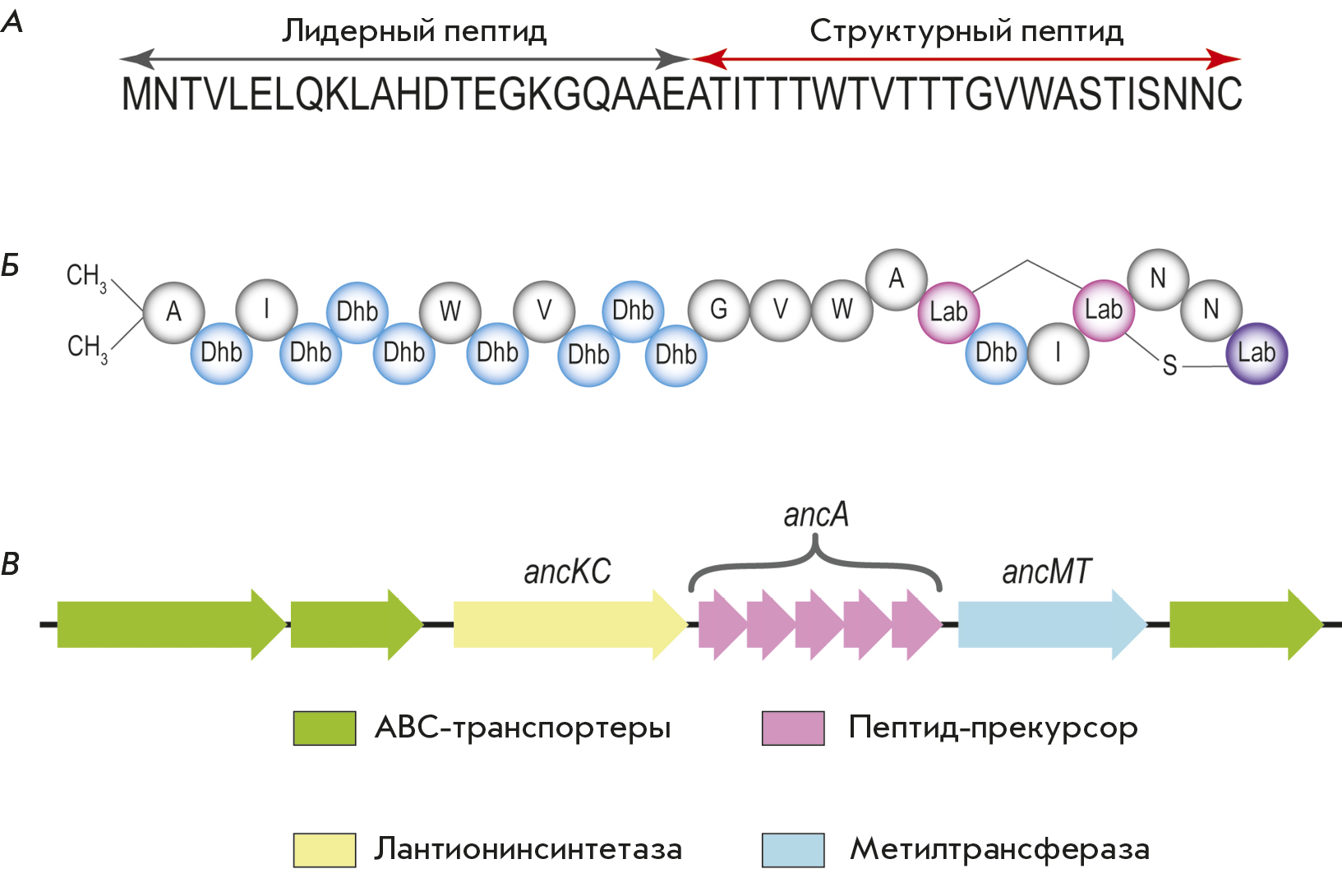Лантипептид андалусицин был выделен из бактерии Bacillus thuringiensis SV andalusiensis B23193 (рис. 1) [7]. Кластер биосинтеза андалусицина содержит гены лантионинсинтетазы III класса AncKC, осуществляющей посттрансляционную модификацию лантипептидов; метилтрансферазы, осуществляющей метилирование; и ABC-транспортеров, осуществляющих экспорт лантипептидов во внеклеточную среду. Зрелый диметилированный андалусицин обладает выраженной антимикробной активностью в отношении многочисленных видов бактерий рода Bacillus, включая B. cereus, вызывающие выраженные токсикоинфекции у человека. Наличие в структуре лабионинового кольца, характерного только для лантипептидов III класса, делает андалусицин особенно интересным объектом для создания искусственного разнообразия антимикробных пептидов и пептидных молекул с улучшенными свойствами.