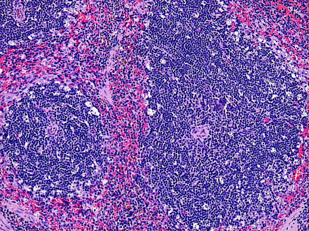 Fig. 4. A fragment of the spleen of an experimental mouse after administration of 80 mg/kg 5'- noraristeromycin. Hematoxylin–eosin staining. 200× magnification