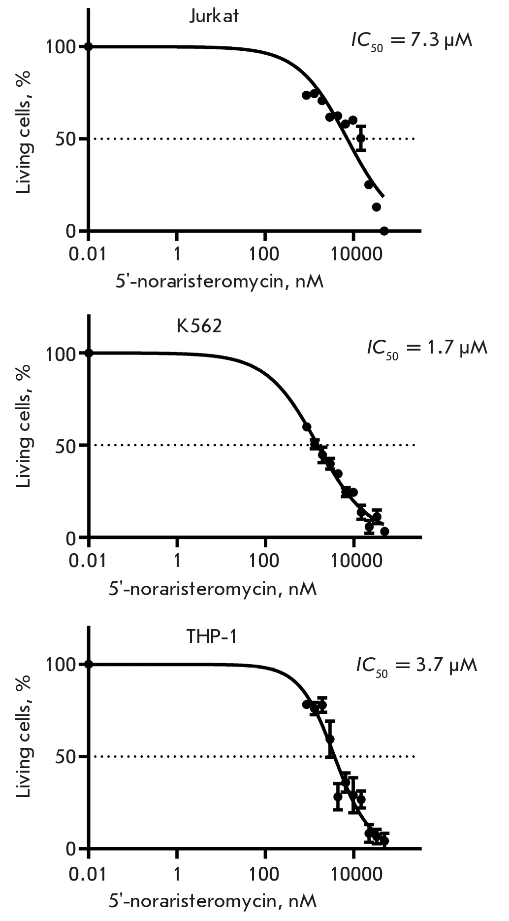 The cytotoxic activity of 5'-noraristeromycin was assessed in continuous Jurkat, THP-1, and K562 human leukemia cells. The drug was shown to exhibit a pronounced cytotoxic activity against all three cell lines. Significant cytotoxicity was observed for 5'-noraristeromycin concentrations < 1 µM. The half-maximal inhibitory concentrations (IC50) of the drug calculated using linear regression were as follows: ~7.3 µM for Jurkat cells, ~1.7 µM for K562 cells, and ~3.7 µM for THP-1 cells (Fig. 1). These values indicate that the drug is also potentially effective in models of laboratory animals, and it would be interesting to further study the mechanisms of its action against malignant leukemia cells.