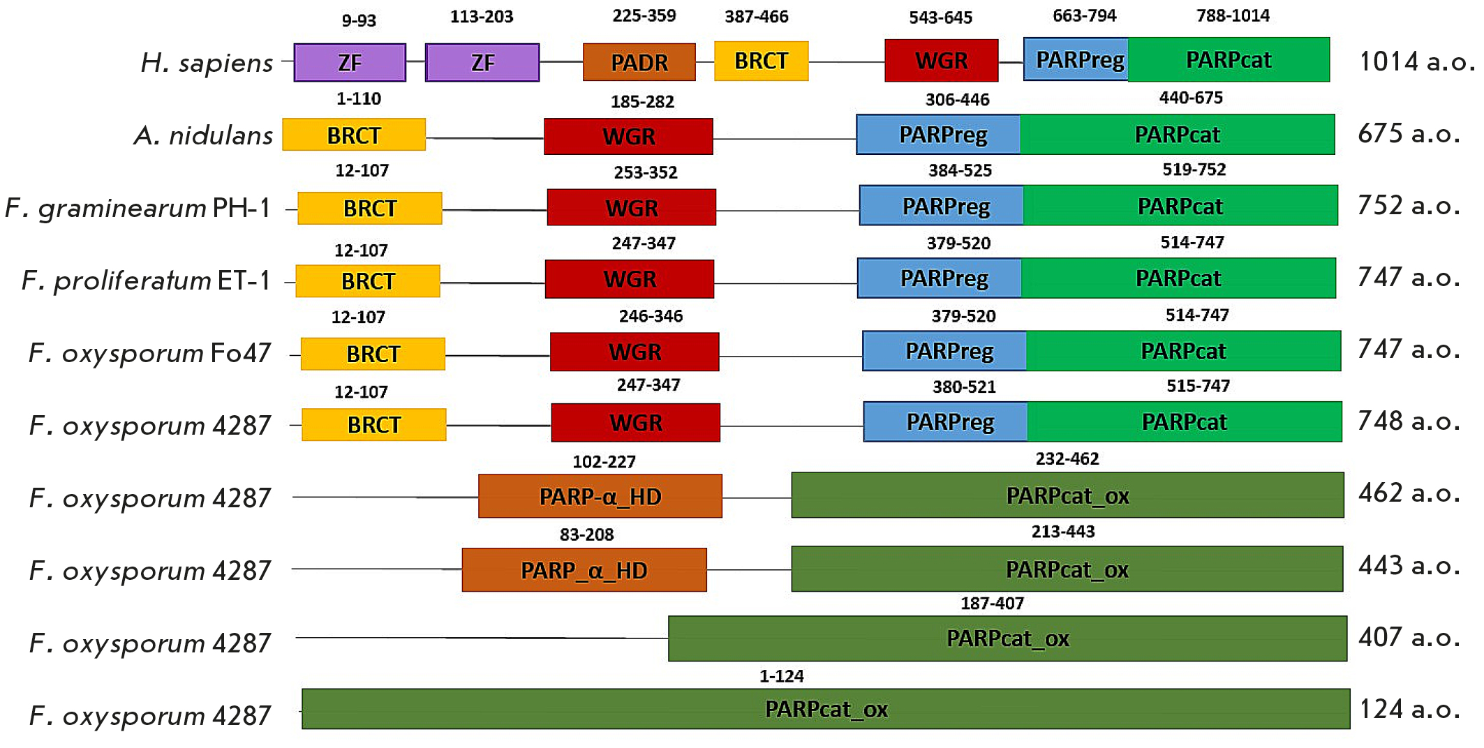 Fig. 1. Schematic representation of the main functional domains of human PARP1, the A. nidulans PrpA, and PARP homologs of four Fusarium strains. The range of amino acids in each domain is indicated above the corresponding domain. ZF is a ‘zinc finger’ structure
