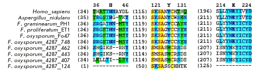 Fig. 2. Fragments of amino acid sequence alignment of human PARP1, the A. nidulans PrpA, and PARP homologs of four Fusarium strains, which contain amino acid residues constituting the H–Y–E motif. Key amino acids are shown in bold