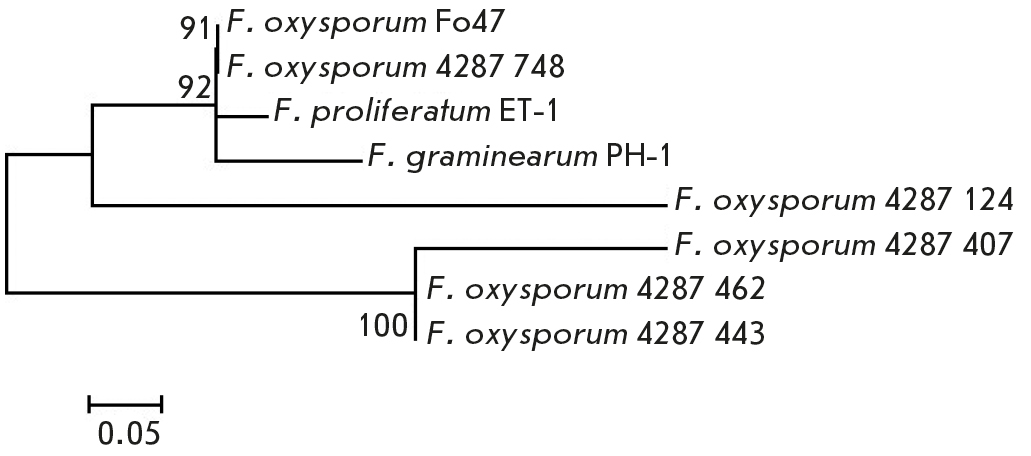 Plant diseases that are caused by phytopathogenic fungi are a significant problem for agriculture and the economy in all regions of the world [1, 2]. Members of some taxonomic groups of the Fungi kingdom, in particular the Fusarium genus, are able not only to infect agricultural crops, but also to produce toxic secondary metabolites – mycotoxins [3] – that inhibit protein synthesis, induce apoptotic processes, and exert hepatotoxic and immunosuppressive effects on mammals [4–7]. The ability to synthesize trichothecene mycotoxins is a factor of fungal aggressiveness to host plants: mutant F. graminearum strains which had not produced deoxynivalenol (DON) were shown to be able to infect a plant, but the infection did not spread to other parts of the plant [8].