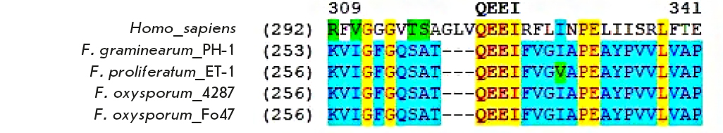 PARG homologs were searched using human PARG as a reference. One open reading frame was identified in each of the analyzed genomes. The translated proteins consisted of 443–476 aa and had a common structure, including an N-terminal α-helical and a C-terminal catalytic domain. In all the structures of the discovered homologs, a glutamine–glutamic acid–glutamic acid–isoleucine (Q–E–E–I) motif was identified, which is considered essential for the functional activity of the enzyme (Fig. 4). In this case, the analysis of amino acid sequence similarities revealed that PARG was a less conservative protein than PARP: the level of identity of PARG from the four analyzed Fusarium strains was 60.5%, and that of the Fusarium and human PARG homologs was only 17.6%.