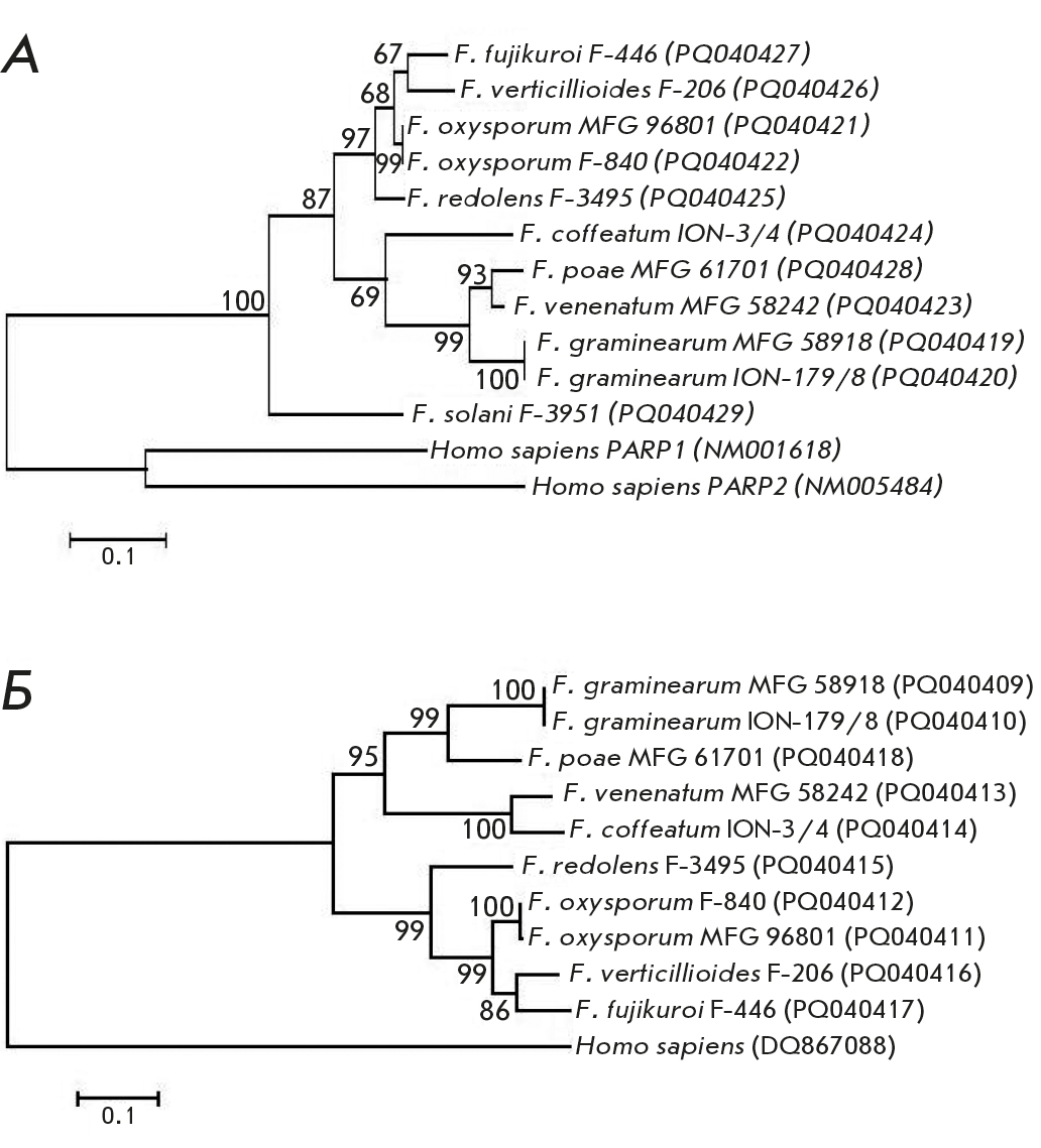 Another objective of the study was to augment available information on the structure and polymorphism of genes encoding the PARP and PARG homologs in Fusarium genus fungi. At present, databases contain only single records of nucleotide sequences characterized as genes encoding components of the parylation system. Universal primers were developed, and sequencing and phylogenetic analysis of fragments of the corresponding genes were performed in strains of nine species of the Fusarium genus available in all-Russian collections. The fragment encoding the catalytic domain of the PARP homolog was shown to be more conserved than the gene fragment encoding the PARG homolog. Interestingly, the topologies of phylogenetic trees constructed based on a comparison of the structures of these two genes also differed slightly. According to the results of the analysis of PARG homologs, the F. coffeatum and F. venenatum species form a separate subcluster supported by a bootstrap value of 100%. This result looks unusual because, despite the similarity of the toxin profiles (the ability to synthesize type A trichothecene toxins), these two species belong to different species complexes (F. coffeatum belongs to the Fusarium incarnatum-equiseti species complex, and F. venenatum belongs to the F. sambucinum species complex). In this case, the topology of the phylogenetic tree constructed based on a comparison of the nucleotide sequences of the gene fragment encoding the PARP homolog had a more classical appearance: F. venenatum formed a subcluster with a closely related F. poae, and F. coffeatum formed a separate branch.