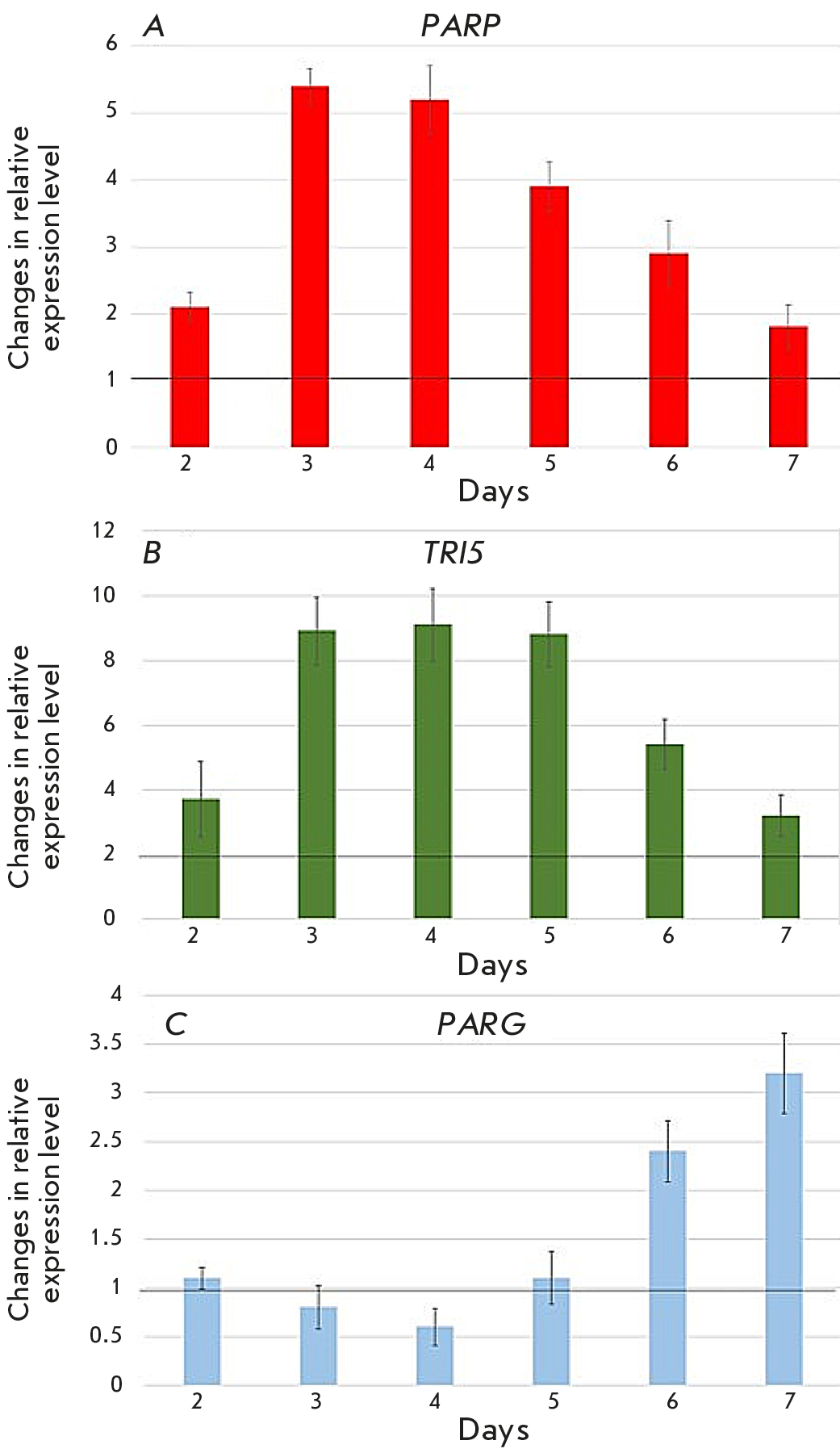 Fig. 6. Estimation of the relative expression levels of the FgPARP (A), TRI5 (B), and FgPARG (C) genes on days 2 to 7 of culture on the MYRO medium compared to the control (PSB, set as 1 unit)