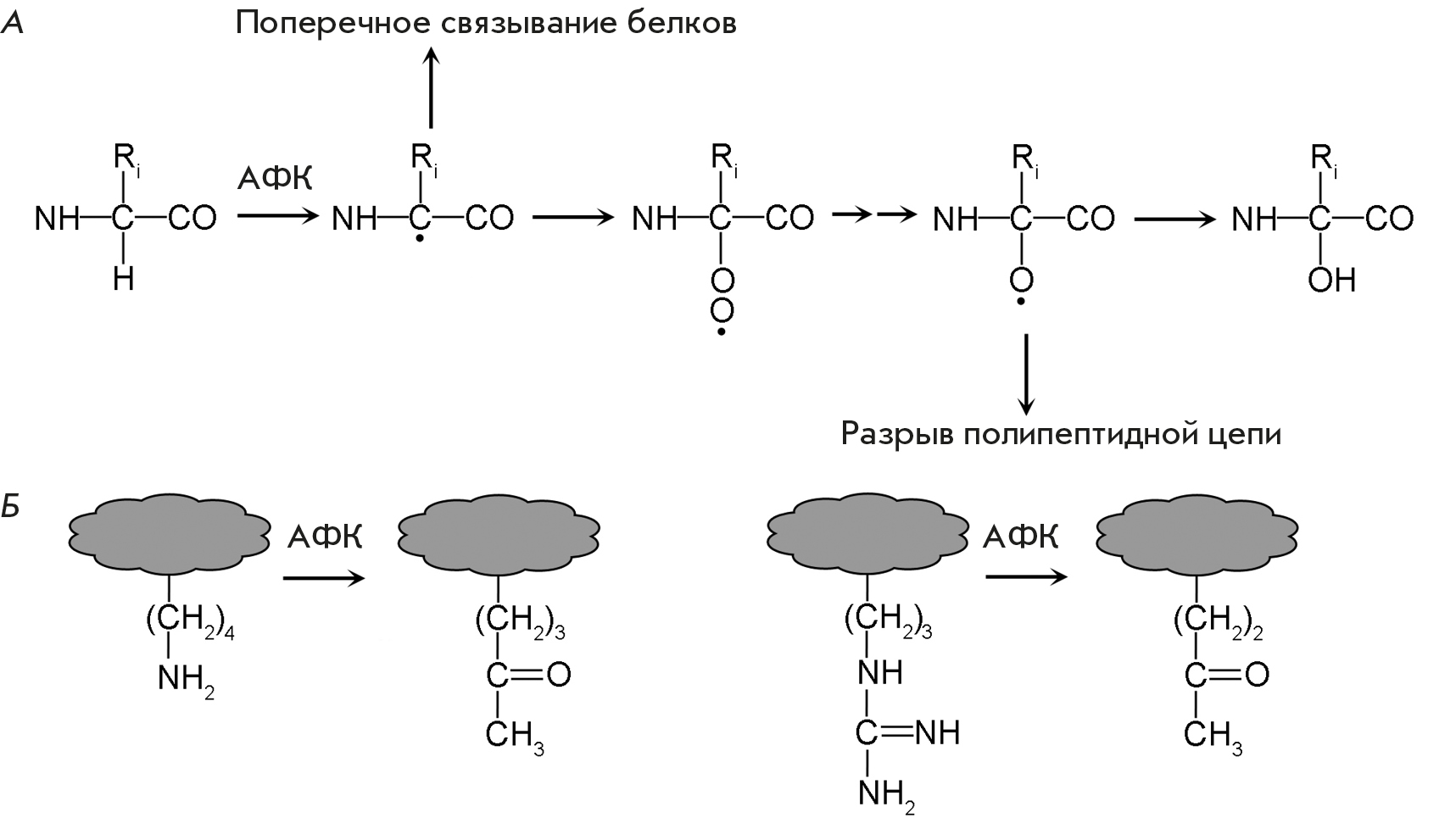 Fig. 4. Irreversible oxidation of the polypeptide chain (A) and amino acid side chains (B) under the action of ROS