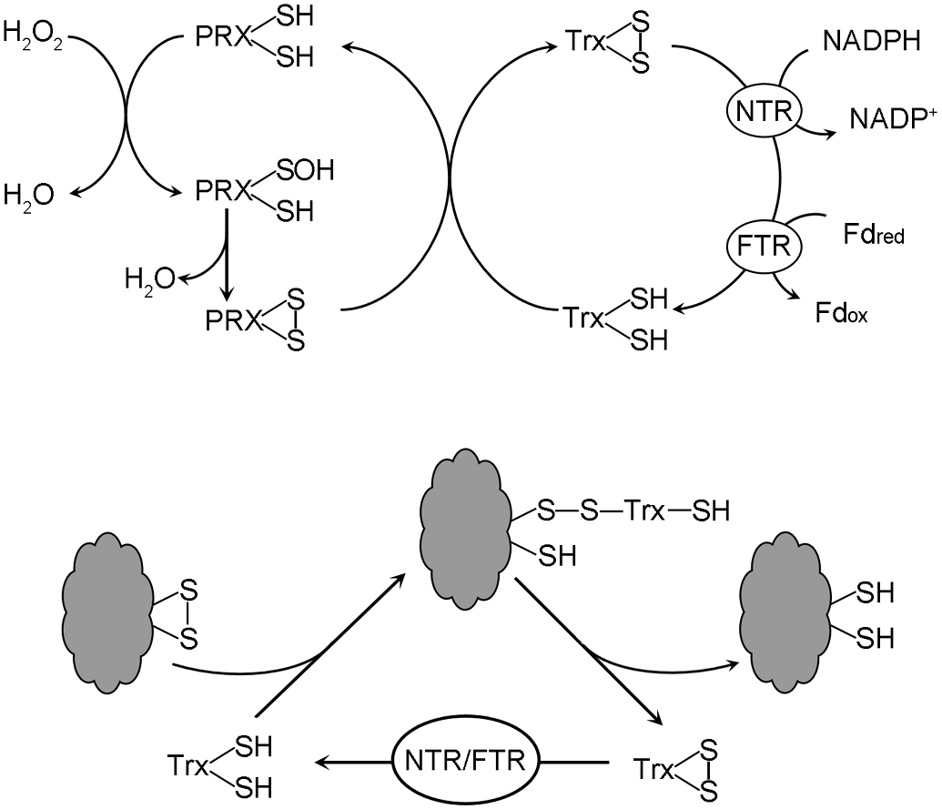 Fig. 6. Catalytic cycles of peroxiredoxins (PRX) and thioredoxins (Trx). NTR and FTR are NADPH–dependent and ferredoxin-dependent thioredoxin reductases, respectively. Fdred – reduced ferredoxin, Fdox – oxidized ferredoxin