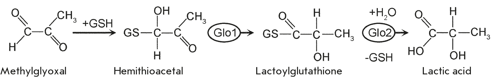 Fig. 2. Detoxification of methylglyoxal (MG) by Glo1 and Glo2 glyoxalases