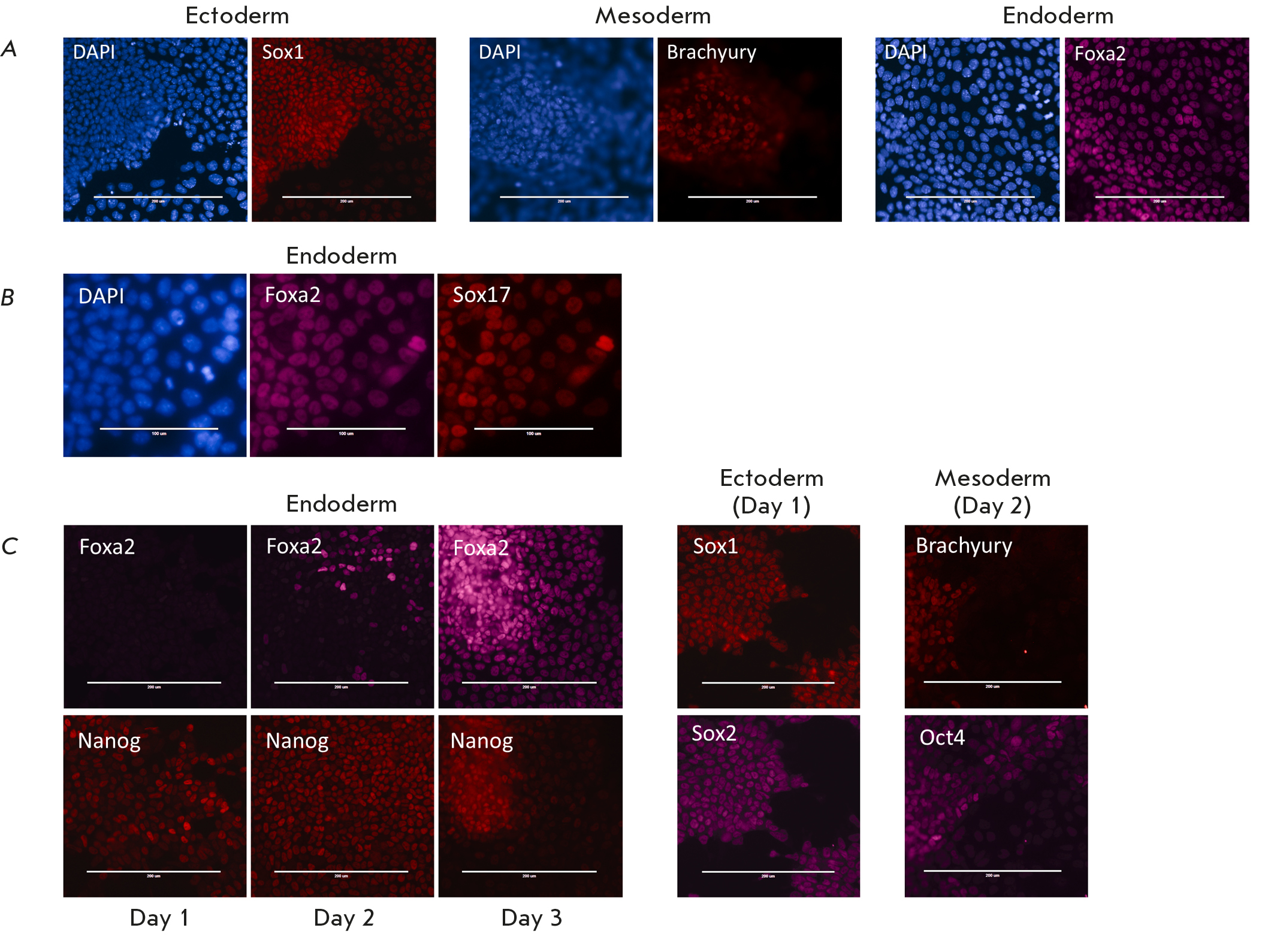 Fig. 2. EpiLCs are receptive to external signals and can be directed toward three lineages. (A) Immunostaining of differentiated cells for Sox1, Brachyury, and Foxa2. Scale bar, 200 μm. (B) Immunostaining of endoderm derivatives for Foxa2 and Sox17. Scale bar, 100 μm. (C) Nanog re-expression during endoderm specification. Oct4 co-localizes with Brachyury during mesoderm specification, while Sox2 is co-stained with Sox1 during neuroectoderm differentiation. Scale bar, 200 μm