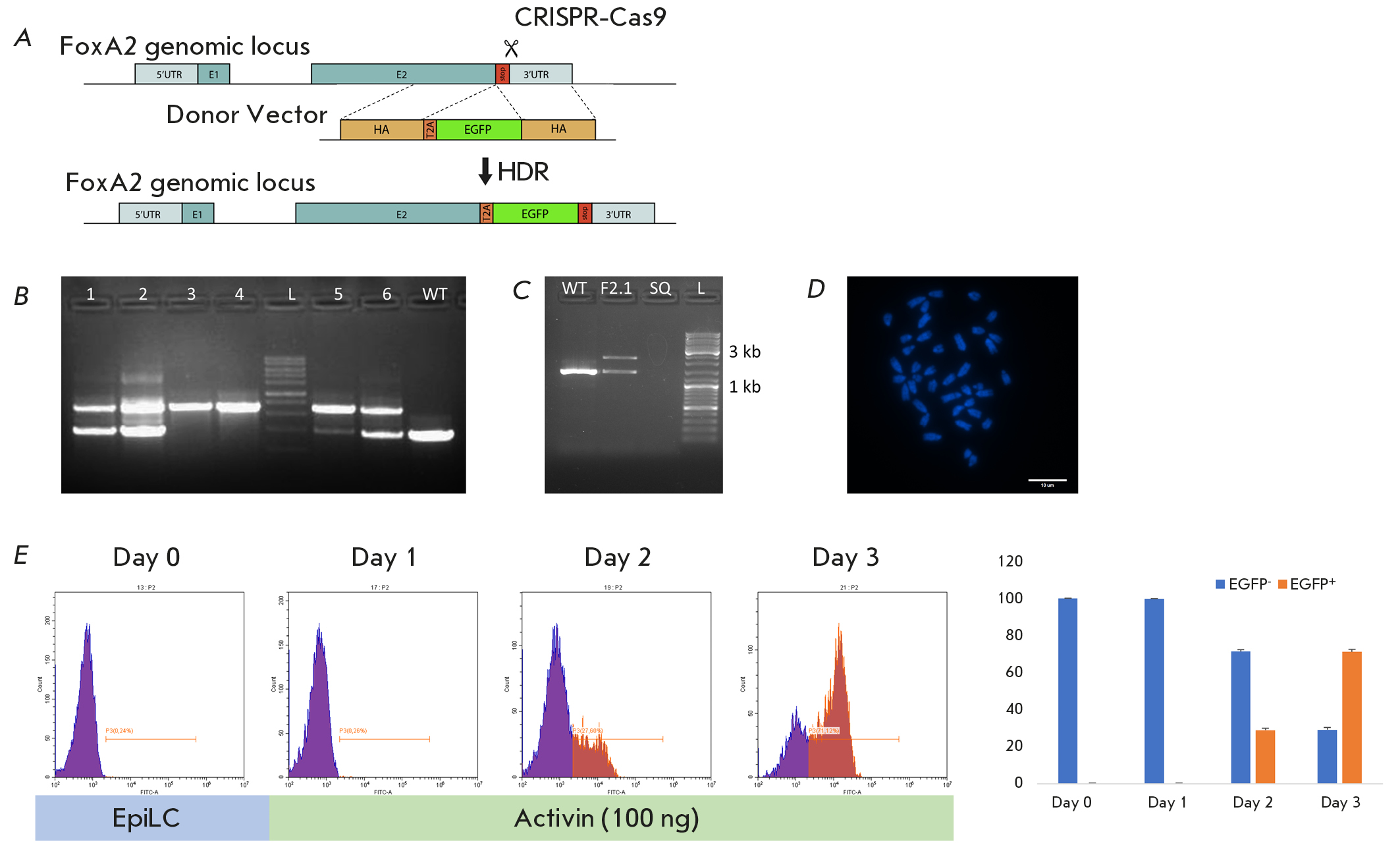 Fig. 3. Establishment of the Foxa2::T2A-EGFP reporter ESC line. (A) Schematic representation of the targeting strategy. E1, E2 – exons; HA – homology arm; UTR – untranslated region; stop – stop codon. (B) Insertion verification by PCR in picked ESC clones. Genomic DNA of the parental cell line (WT) was used as a control. (C) Repeated insertion verification in the subcloned cell line. (D) Normal karyotype (40 XY) of the established reporter ESC line F2.1. Scale bar, 10 μm. (E) Left panel – flow cytometry analysis of EGFP expression of the F2.1 ESCs during DE specification; right panel – percentage of EGFP– and EGFP+ cells during DE differentiation; results are expressed as the mean of three replicates ± SD