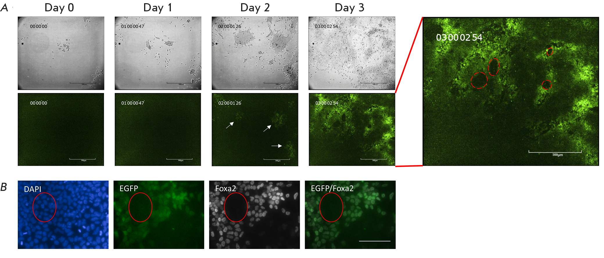 Fig. 4. Live imaging of DE specification in vitro. (A) Time-lapse microscopy of the F2.1 ESCs during DE specification. Arrows indicate EGFP+ emerging cells. Scale bar, 500 μm. The time-lapse video can be found in the Supplementary material. (B) Co-localization of EGFP with Foxa2 following differentiation of the F2.1 ESCs into DE. Scale bar, 100 μm