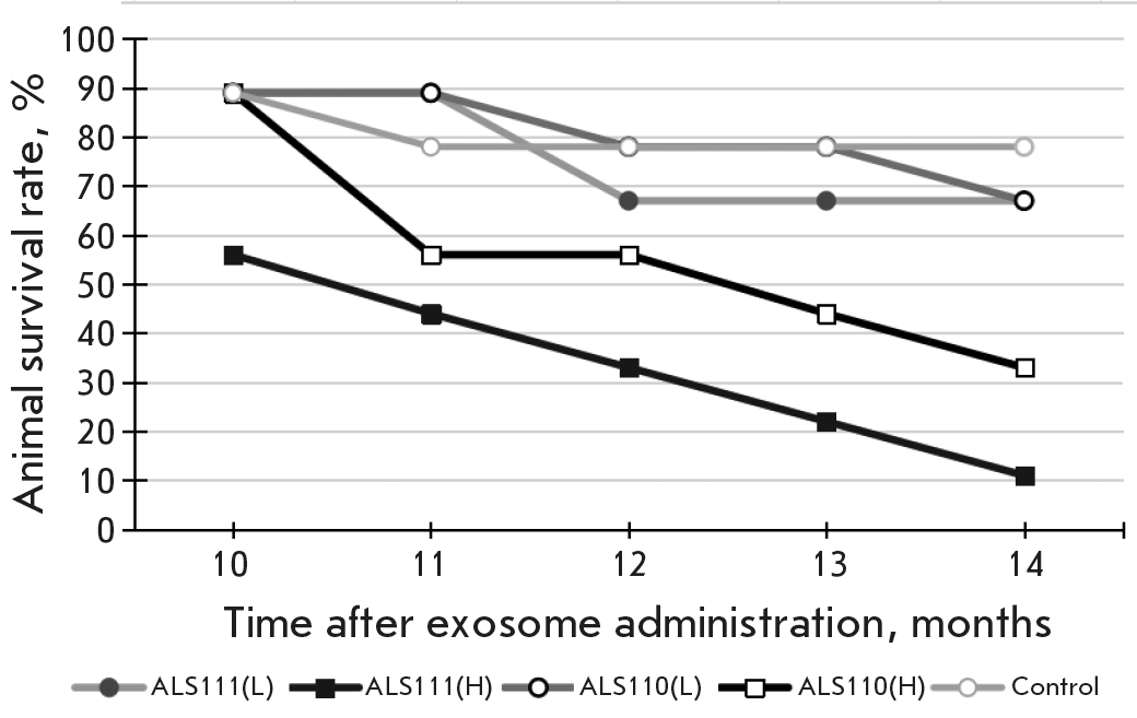 The first signs of motor disorders in individual animals were noted 9 months after exosome administration. By month 10–11, the number of mice with signs of disease had increased (Fig. 1), primarily among animals in the ALS111(H) and ALS110(H) groups; i.e., mice receiving a higher drug dose. Examination revealed fur thinning, minor porphyrin discharges from the eyes and nose, and a decrease in body weight (Fig. 2B).