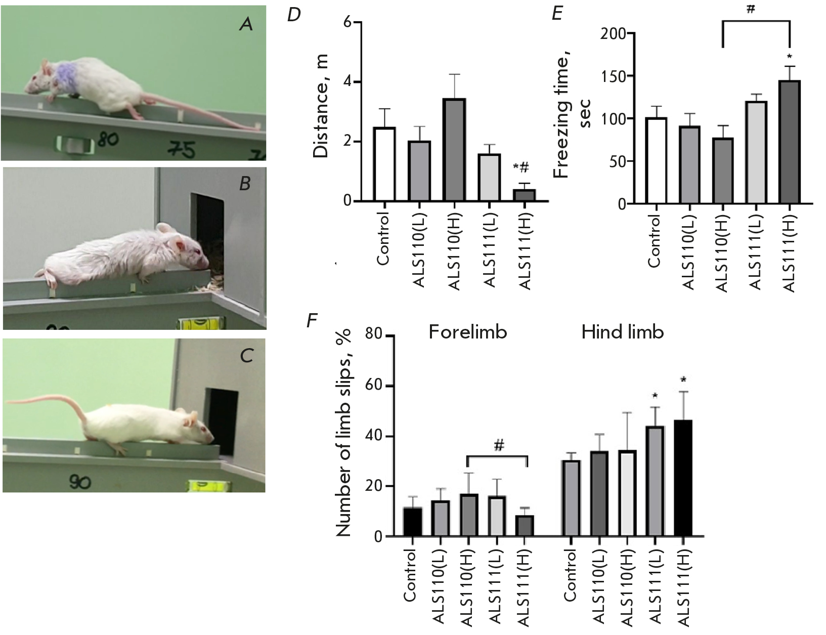 Fig. 2. Appearance of G93A (A) and ALS111 mice (B) after the onset of ALS symptoms. Control animal (C); distance traveled (D) and immobility time (E) during OF testing; number of limb slips from the upper bar (in %) per NB (E). * p < 0.05 compared to the control group. # p < 0.05 compared to the ALS110 (H) group. Data are presented as mean ± SEM