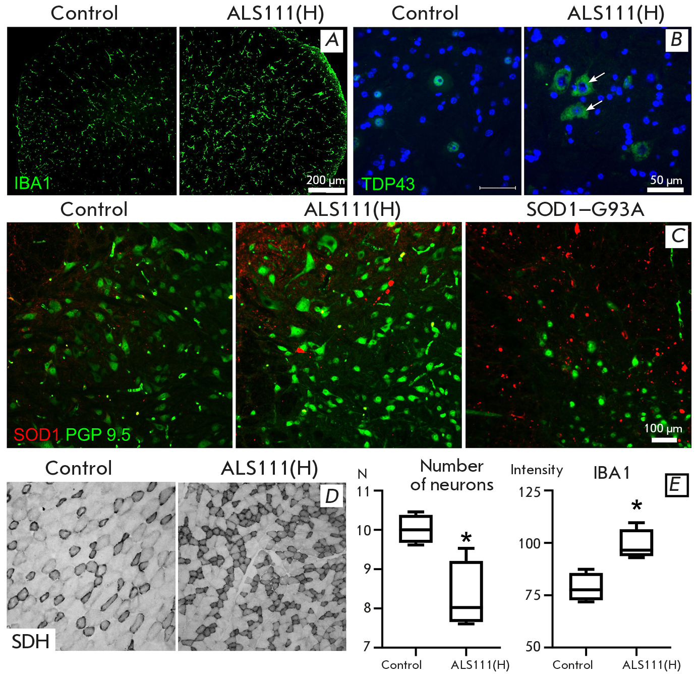 Fig. 3. Morphological examination. (A) – microglia activation. Microglia marker protein IBA1 staining. Ventral horn of the spinal cord, lumbar region. (B) TDP43 localization (green color) in motor neurons. Arrows indicate TDP43 localization in the cytoplasm. Ventral horn of the spinal cord, lumbar section. (C) SOD1 accumulation in the spinal cord of experimental animals. SOD1 (red) and PGP9.5 (green) localization. Ventral horn of the spinal cord, lumbar region. (D) – increase in the number of SDH-positive fibers. Anterior tibial muscle. (E) Changes in motor neurons and neuroglia. Decrease in the number of motor neurons of the ventral horns of the spinal cord (cells in the field of view), increase in the intensity of the staining for the microglia marker protein IBA1. * p < 0.05, Mann-Whitney criterion. Data are presented as a median and the interquartile range