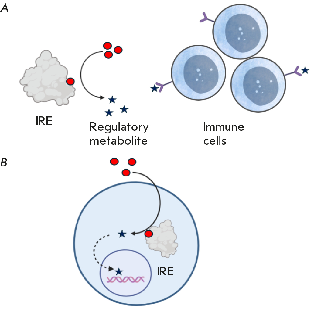 Fig. 3. The mechanism of immune cell regulation through the synthesis of a regulatory metabolite. (A) Synthesis of a regulatory metabolite outside the cell (external regulation); (B) synthesis of a regulatory metabolite inside the cell (internal regulation)