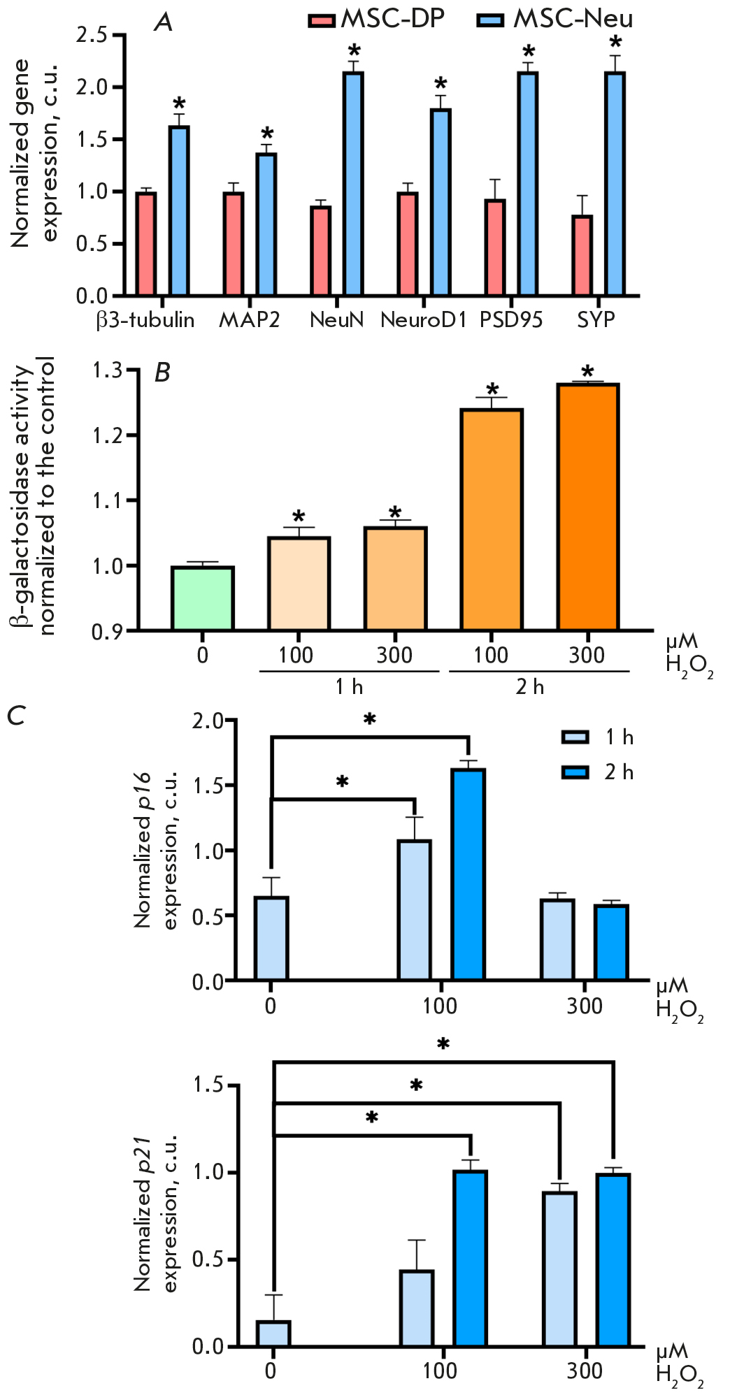Fig. 1. Hydrogen peroxide induces senescence in reprogrammed human MSC-Neu neurons. (A) Expression of neuronal markers in MSC-DP (before differentiation) and MSC-Neu (after differentiation) cells. Actin mRNA was used as a control. (B) Incubation of MSC-Neu cells with 100 and 300 μM hydrogen peroxide for 1 and 2 h increases β-galactosidase activity. (C) Incubation of MSC-Neu cells in the presence of 100 and 300 μM hydrogen peroxide for 1 and 2 h increases the p16 and p21 mRNA levels. Data represent the mean ± standard deviation of three separate experiments; differences are significant at *p < 0.05 (determined using the Mann–Whitney test)