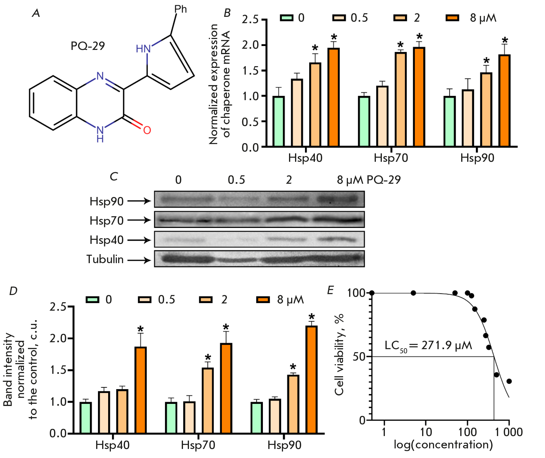 Fig. 2. PQ-29 at non-toxic doses increases chaperone levels in MSC-Neu under oxidative stress. (A) PQ-29 structural formula. (B) Chaperone expression in MSC-Neu cells after 6-h incubation with PQ-29. (C) Western blot analysis of the Hsp90, Hsp70, and Hsp40 levels in MSC-Neu cell lysates incubated with PQ-29 at the indicated concentrations for 24 h. Tubulin was used as a loading control. Representative images are provided. (D) Band intensity ratios of Hsp90, Hsp70, Hsp40, and tubulin normalized to the control cells. (E) PQ-29 LC50 in MSC-Neu cells under oxidative stress. Data represent the mean ± standard deviation of three separate experiments; the observed differences are statistically significant at *p < 0.05 (determined using the Mann–Whitney test)