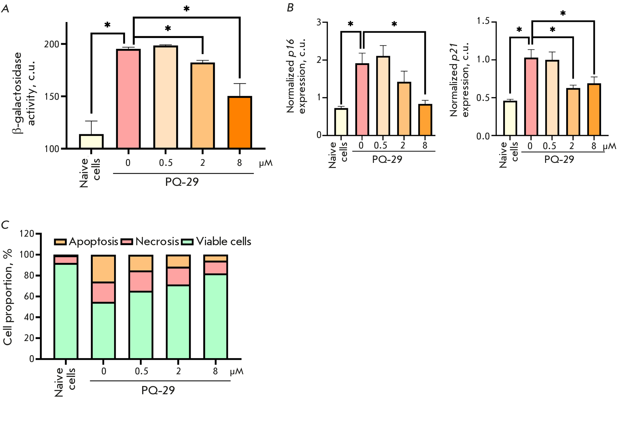 Fig. 3. PQ29 prevents oxidative stress-induced senescence in MSC-Neu cells. (A) β-galactosidase activity in MSC-Neu cells after 24-h incubation in the presence of PQ-29 and senescence induction by hydrogen peroxide. A mammalian Beta-Glo assay system was used. (B) Expression of p16 (left panel) and p21 (right panel) in MSC-Neu cells after 24-h incubation with PQ-29 and senescence induction by hydrogen peroxide. (C) Acridine orange staining. The proportion of viable, apoptotic, and necrotic MSC-Neu cells after 24-h incubation in the presence of PQ-29 and senescence induction by hydrogen peroxide is presented. Data represent the mean ± standard deviation of three separate experiments; the observed differences are statistically significant at *p < 0.05 (determined using the Mann–Whitney test)